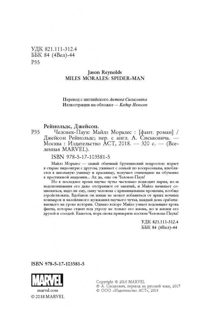 ОписаниеМайлз Моралес - самый обычный бруклинский подросток: играет в старые видеоигры с другом, ужинает с семьей по воскресеньям, влюбляется в школьную умницу и красавицу, получает стипендию на обучение в престижной академии... Ах да, еще он Человек-Паук! Но в последнее время паучье чутье частенько подводит парня, из-за недопонимания его даже отстраняют от занятий, и Майлз начинает сомневаться, надо ли ему, сыну человека с криминальным прошлым, вообще геройствовать. Вдобавок он никак не может избавиться от ярких ночных кошмаров и назойливого жужжания паучьего чутья, каждый день срабатывающего на уроке истории. Однако вскоре Майлз узнает леденящие кровь факты, которые ставят под угрозу не только его жизнь, но и жизни его друзей и соседей. Кажется, пора снова примерить костюм Человека-Паука!Майлз Моралес - самый обычный бруклинский подросток: играет в старые видеоигры с другом, ужинает с семьей по воскресеньям, влюбляется в школьную умницу и красавицу, получает стипендию на обучение в престижной академии... Ах да, еще он Человек-Паук! Но в последнее время паучье чутье частенько подводит парня, из-за недопонимания его даже отстраняют от занятий, и Майлз начинает сомневаться, надо ли ему, сыну человека с криминальным прошлым, вообще геройствовать. Вдобавок он никак не может избавиться от ярких ночных кошмаров и назойливого жужжания паучьего чутья, каждый день срабатывающего на уроке истории. Однако вскоре Майлз узнает леденящие кровь факты, которые ставят под угрозу не только его жизнь, но и жизни его друзей и соседей. Кажется, пора снова примерить костюм Человека-Паука!
