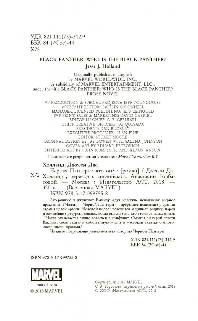 ОписаниеЗатерянную в джунглях Ваканду ждут нелегкие испытания: мирное правление Т'Чаллы - Черной Пантеры - прерывает появление у границ страны целой армии. Молодой король готовится защищать родину, народ и важнейшие ресурсы, однако, когда выясняется, кто стоит за нападением, Т'Чалла оказывается лично вовлечен в конфликт. Сможет ли герой спасти Ваканду, свою семью и собственную жизнь в жестокой схватке с многочисленными врагами?Читайте потрясающе увлекательную историю Черной Пантеры!Затерянную в джунглях Ваканду ждут нелегкие испытания: мирное правление Т'Чаллы - Черной Пантеры - прерывает появление у границ страны целой армии. Молодой король готовится защищать родину, народ и важнейшие ресурсы, однако, когда выясняется, кто стоит за нападением, Т'Чалла оказывается лично вовлечен в конфликт. Сможет ли герой спасти Ваканду, свою семью и собственную жизнь в жестокой схватке с многочисленными врагами?Читайте потрясающе увлекательную историю Черной Пантеры!