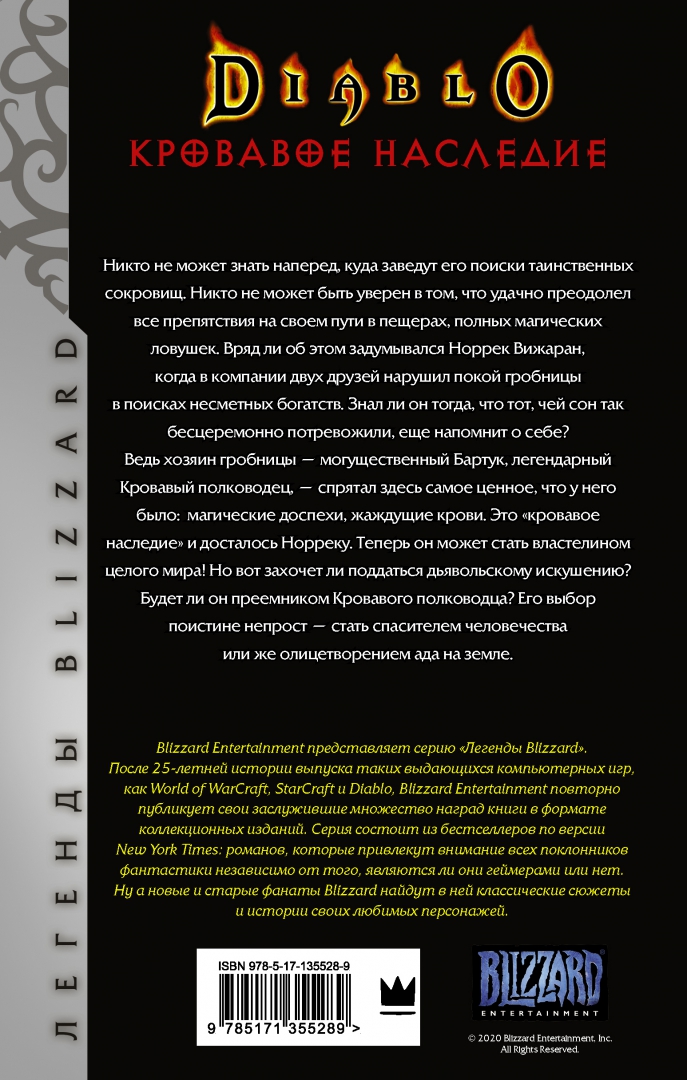СвернутьНикто не может знать наперед, куда заведут его поиски таинственных сокровищ. Никто не может быть уверен в том, что удачно преодолел все препятствия на своем пути в пещерах, полных магических ловушек. Вряд ли об этом задумывался Норрек Вижаран, когда в компании двух друзей нарушил покой гробницы в поисках несметных богатств. Знал ли он тогда, что тот, чей сон так бесцеремонно потревожили, еще напомнит о себе?Ведь хозяин гробницы - могущественный Бартук, легендарный Кровавый полководец, - спрятал здесь самое ценное, что у него было, - магические доспехи, жаждущие крови. Это "кровавое наследие" и досталось Норреку. Теперь он может стать властелином целого мира! Но вот захочет ли он поддаться дьявольскому искушению? Будет ли он преемником Кровавого полководца? Его выбор поистине не прост - стать спасителем человечества или же олицетворением ада на земле.Пещеры полны монстров и несметных богатств. Но спускаться в них способны только храбрецы или авантюристы. Норрек и его друзья готовы рискнуть, ведь древняя гробница выглядит лакомым источником драгоценной наживы, а не началом опасной миссии.