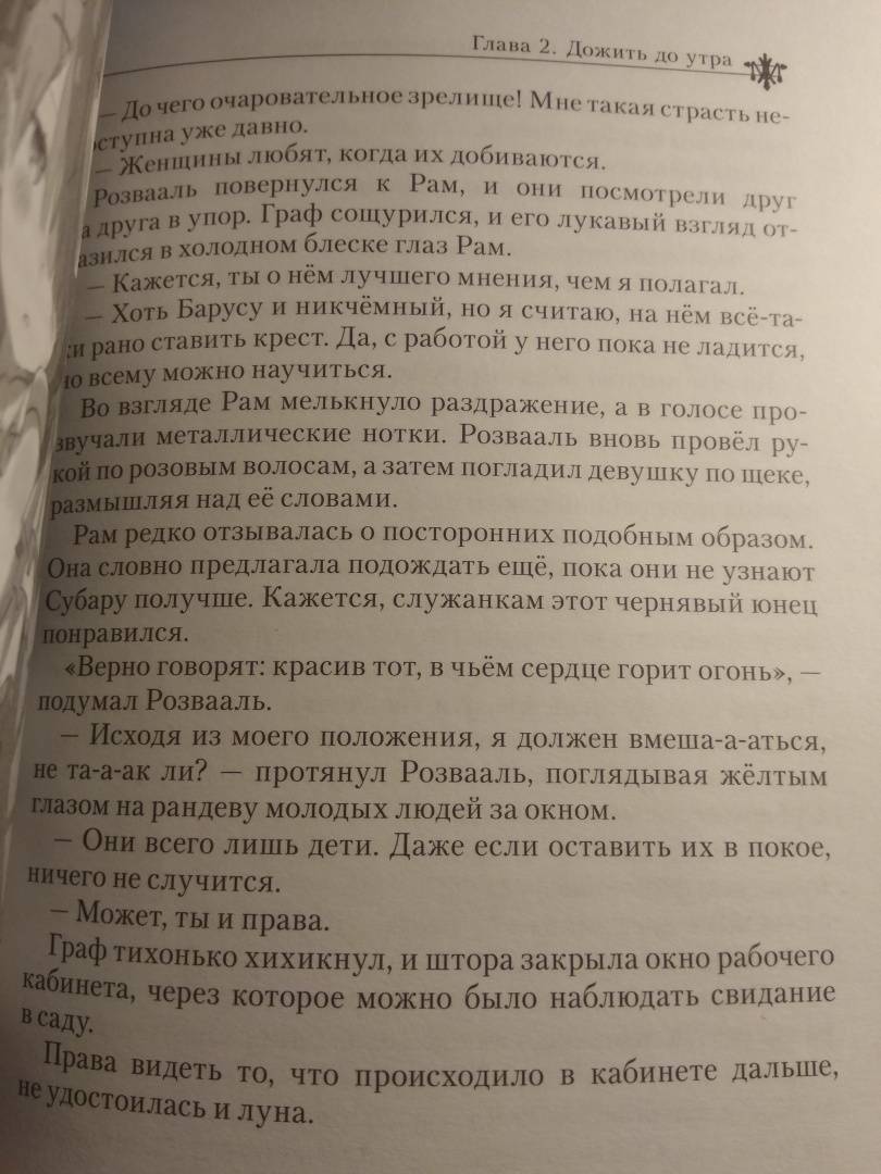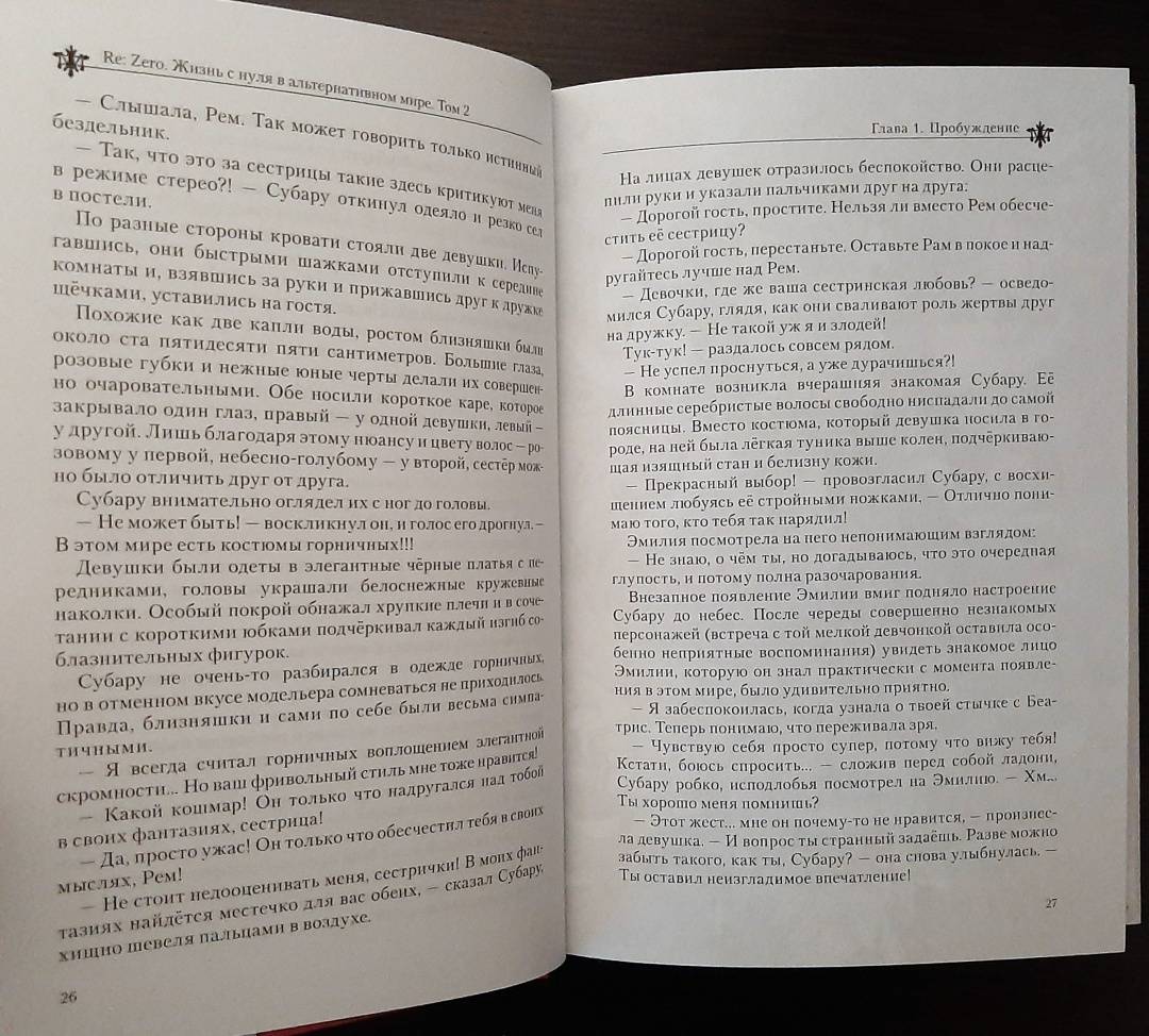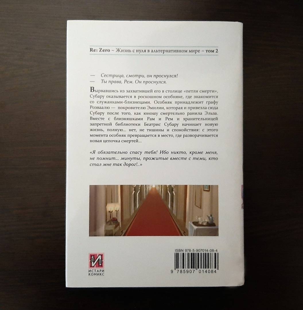 Описание— Сестрица, смотри, он проснулся! — Ты права, Рем. Он проснулся. Вырвавшись из захватившей его в столице «петли смерти», Субару оказывается в роскошном особняке, где знакомится со служанками-близняшками. Особняк принадлежит графу Розваалю — покровителю Эмилии, которая привезла сюда Субару после того, как юношу смертельно ранила Эльза. Вместе с близняшками Рам и Рем, а также хранительницей запретной библиотеки Беатрис, Субару начинает новую жизнь, полную… нет, не тишины и спокойствия. С этого момента особняк превращается в место, где разворачивается новая цепочка смертей… «Я обязательно спасу тебя! Ибо никто, кроме меня, не помнит… минуты, прожитые вместе с теми, кто стал мне так дорог!..»Издание второе— Сестрица, смотри, он проснулся! — Ты права, Рем. Он проснулся. Вырвавшись из захватившей его в столице «петли смерти», Субару оказывается в роскошном особняке, где знакомится со служанками-близняшками. Особняк принадлежит графу Розваалю — покровителю Эмилии, которая привезла сюда Субару после того, как юношу смертельно ранила Эльза. Вместе с близняшками Рам и Рем, а также хранительницей запретной библиотеки Беатрис, Субару начинает новую жизнь, полную… нет, не тишины и спокойствия. С этого момента особняк превращается в место, где разворачивается новая цепочка смертей… «Я обязательно спасу тебя! Ибо никто, кроме меня, не помнит… минуты, прожитые вместе с теми, кто стал мне так дорог!..»Издание второе