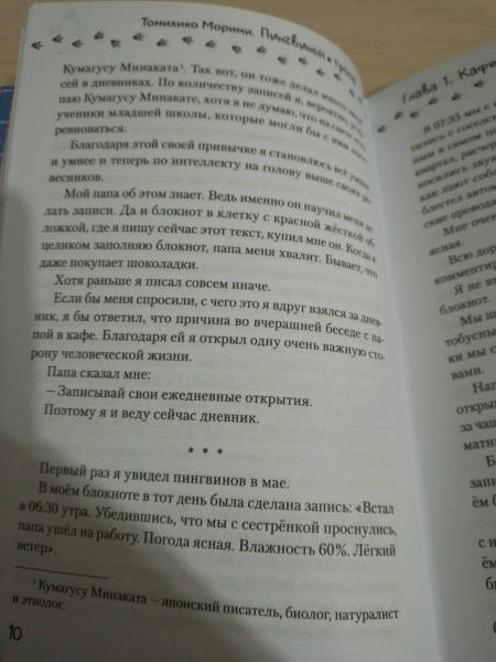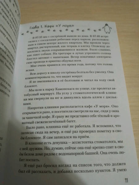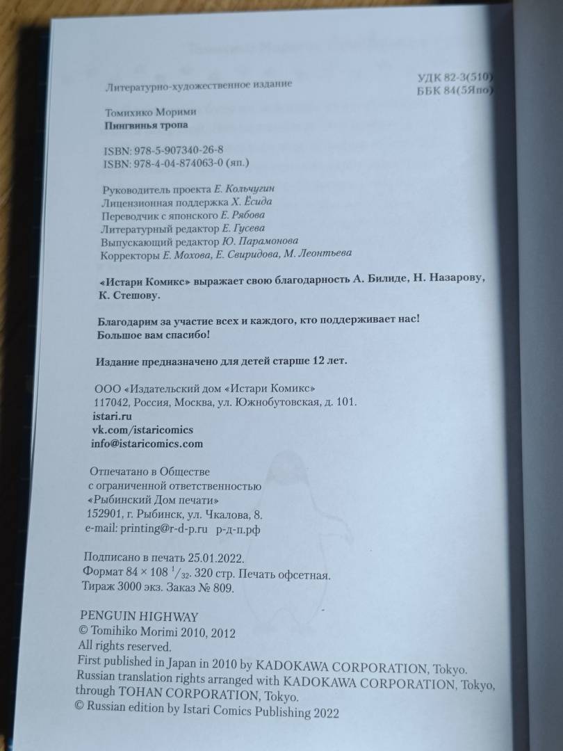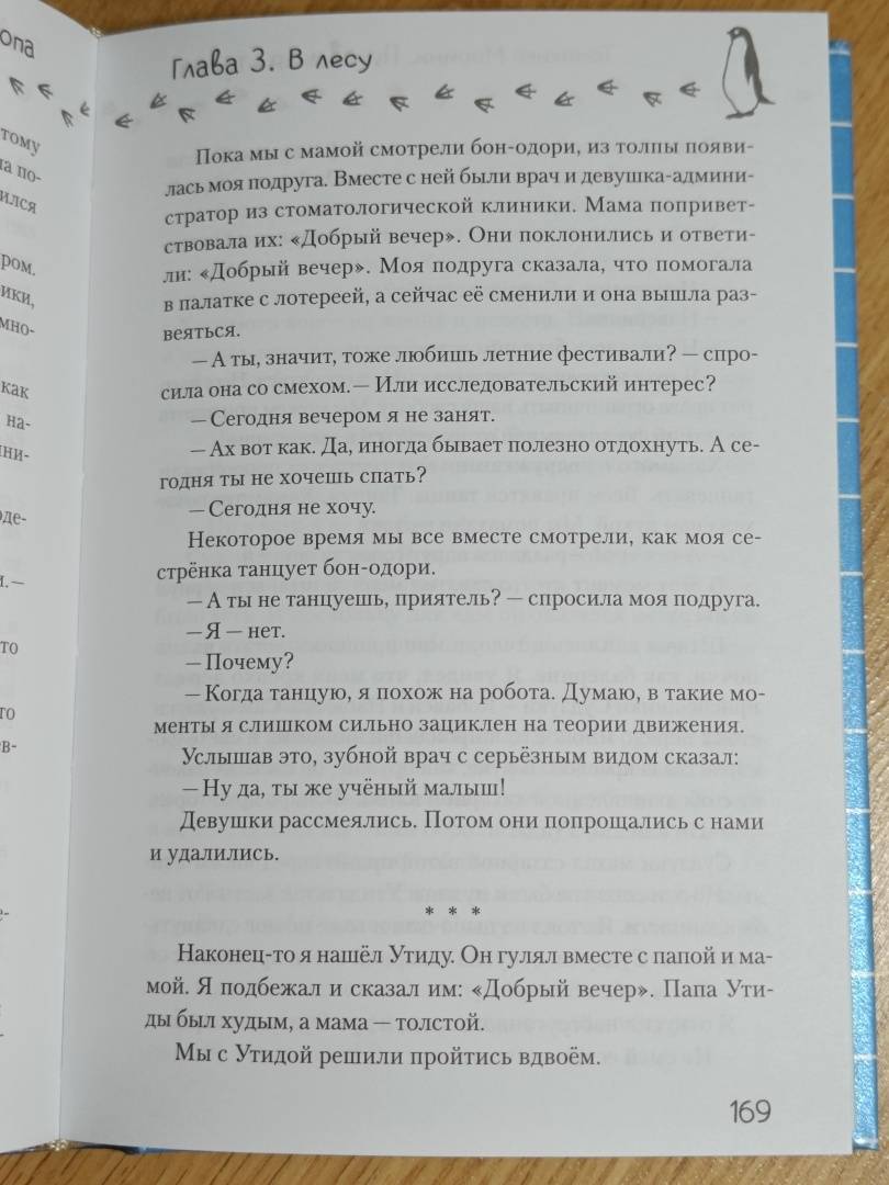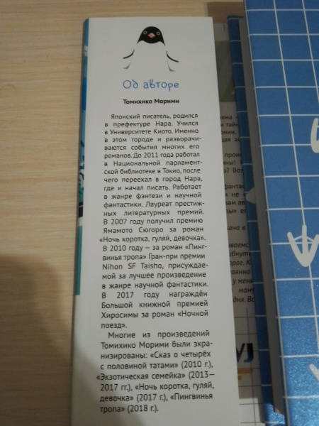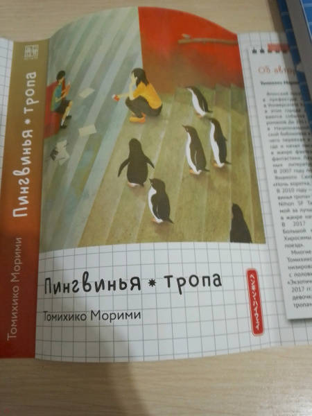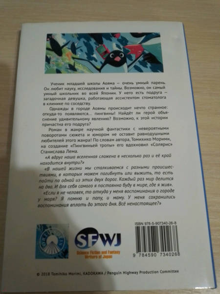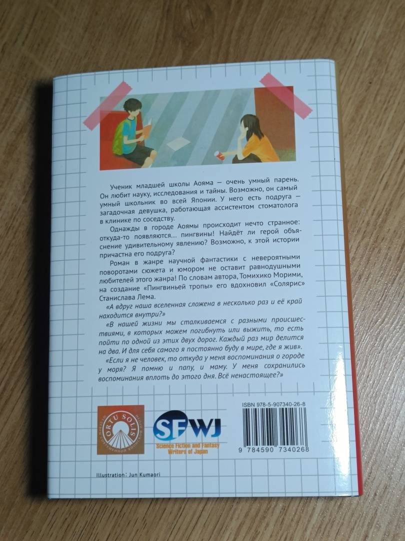 ОписаниеУченик младшей школы Аояма — очень умный парень. Он любит науку, исследования и тайны. Возможно, он самый умный школьник во всей Японии. У него есть подруга — загадочная девушка, работающая ассистентом стоматолога в клинике по соседству. Однажды в городе Аоямы происходит нечто странное: откуда-то появляются... пингвины! Найдёт ли герой объяснение удивительному явлению? Возможно, к этой истории причастна его подруга?История в жанре научной фантастики с невероятными поворотами сюжета и юмором не оставит равнодушными любителей этого жанра! По словам автора, Томихико Морими, на создание «Пингвиньей тропы» его вдохновил «Солярис» Станислава Лема.Роман выиграл литературную премию Японии Nihon SF Taisho за лучшее произведение в жанре научной фантастики и фэнтези в 2010 году.Особенность этого издания — двухсторонняя суперобложка.Ученик младшей школы Аояма — очень умный парень. Он любит науку, исследования и тайны. Возможно, он самый умный школьник во всей Японии. У него есть подруга — загадочная девушка, работающая ассистентом стоматолога в клинике по соседству. Однажды в городе Аоямы происходит нечто странное: откуда-то появляются... пингвины! Найдёт ли герой объяснение удивительному явлению? Возможно, к этой истории причастна его подруга?История в жанре научной фантастики с невероятными поворотами сюжета и юмором не оставит равнодушными любителей этого жанра! По словам автора, Томихико Морими, на создание «Пингвиньей тропы» его вдохновил «Солярис» Станислава Лема.Роман выиграл литературную премию Японии Nihon SF Taisho за лучшее произведение в жанре научной фантастики и фэнтези в 2010 году.Особенность этого издания — двухсторонняя суперобложка.