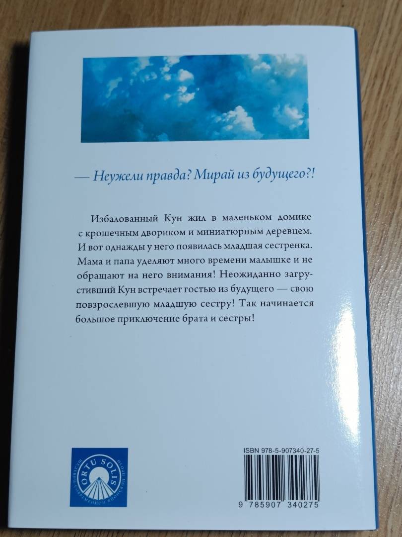 ОписаниеИзбалованный Кун жил в маленьком домике с крошечным двориком и миниатюрным деревцем. И вот однажды у него появилась младшая сестрёнка. Мама и папа уделяют много времени малышке и не обращают на него внимания! Неожиданно загрустивший Кун встречает гостью из будущего — свою повзрослевшую младшую сестру! Так начинается большое приключение брата и сестры!Избалованный Кун жил в маленьком домике с крошечным двориком и миниатюрным деревцем. И вот однажды у него появилась младшая сестрёнка. Мама и папа уделяют много времени малышке и не обращают на него внимания! Неожиданно загрустивший Кун встречает гостью из будущего — свою повзрослевшую младшую сестру! Так начинается большое приключение брата и сестры!