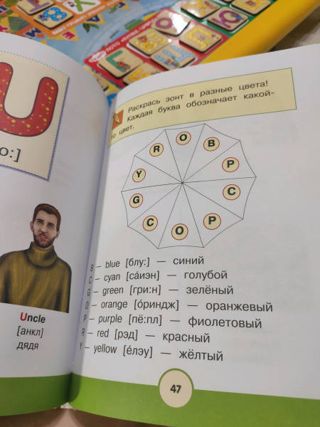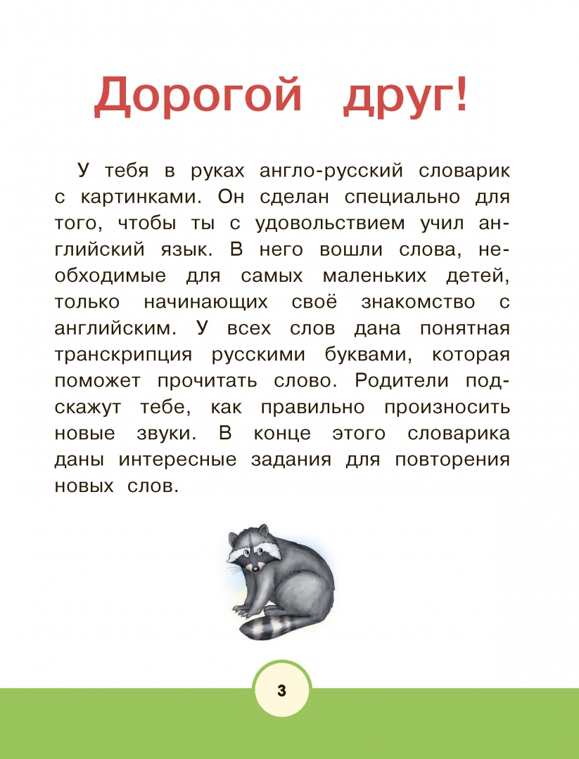 ОписаниеДанный словарь поможет вашему ребенку сделать первые шаги в изучении английского языка. Яркие картинки, несложные слова с русской транскрипцией, занимательные игры и задания для запоминания слов сделают процесс обучения приятным и простым. Книга предназначается для детей младшего дошкольного возраста, а также будет прекрасным подспорьем для родителей и воспитателей.Данный словарь поможет вашему ребенку сделать первые шаги в изучении английского языка. Яркие картинки, несложные слова с русской транскрипцией, занимательные игры и задания для запоминания слов сделают процесс обучения приятным и простым. Книга предназначается для детей младшего дошкольного возраста, а также будет прекрасным подспорьем для родителей и воспитателей.