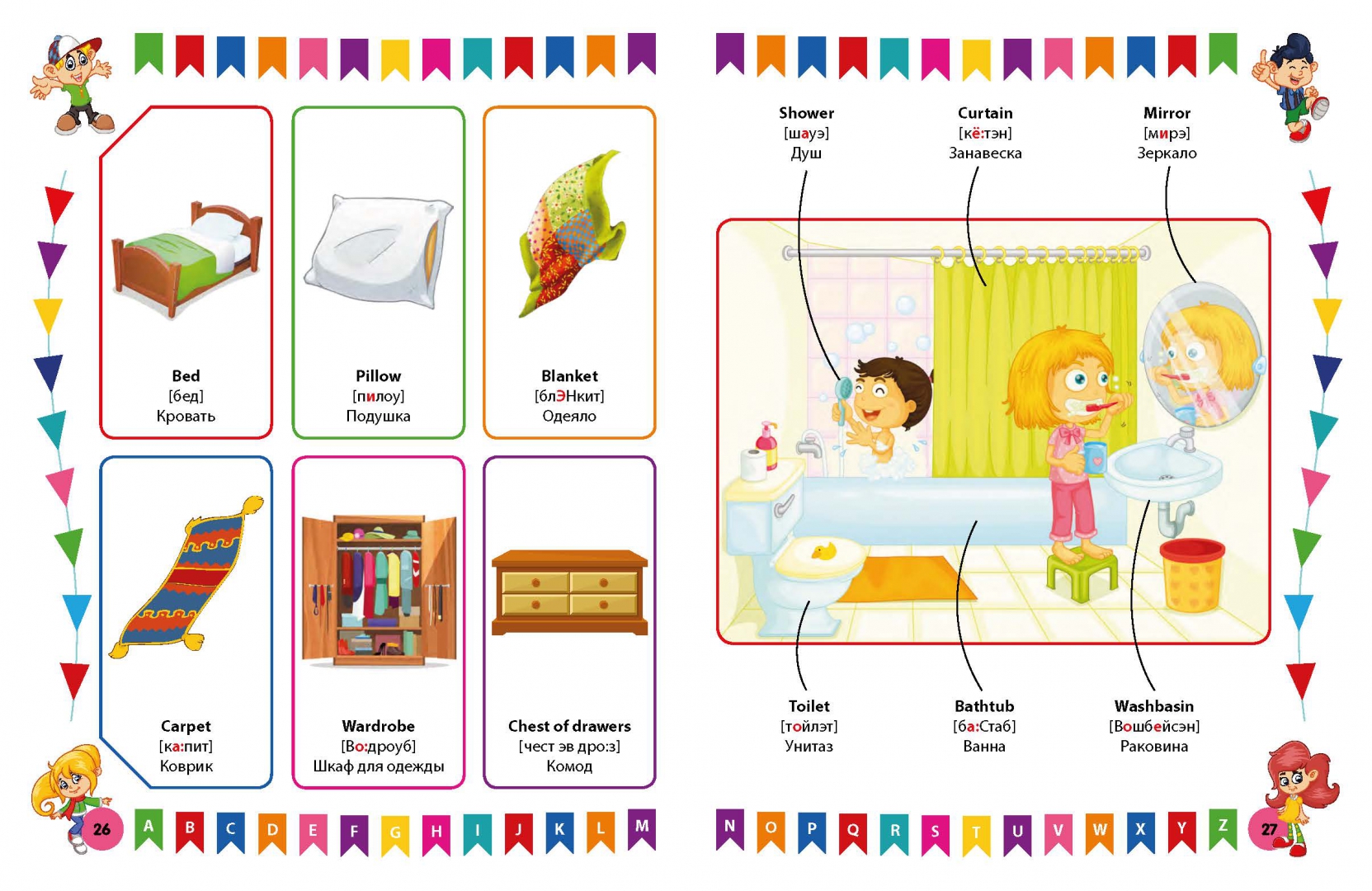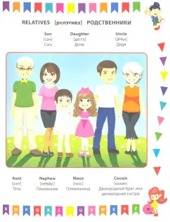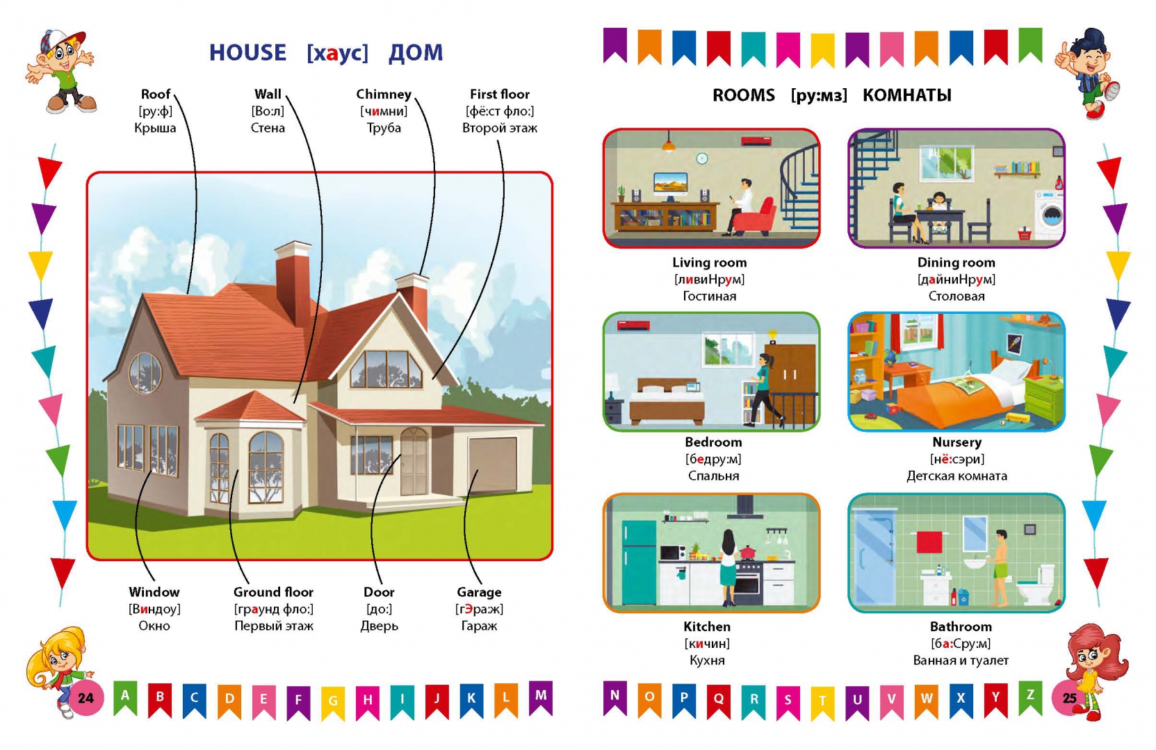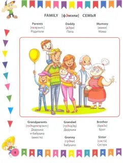 ОписаниеУважаемые родители!Эта полезная красочная книга поможет вашему ребёнку сделать первые шаги в изучении английского языка. А яркие иллюстрации сделают обучение весёлым и увлекательным. Вместе со своим малышом вы узнаете, как по-английски называются члены вашей семьи, различные профессии, животные и птицы, какие предметы окружают вас в вашем доме, в саду и в городе, сможете рассказать про погоду, назвать дни недели и месяцы и многое другое. Скорее открывайте нашу книгу и отправляйтесь вместе с ребёнком в первое путешествие по миру английского языка!Уважаемые родители!Эта полезная красочная книга поможет вашему ребёнку сделать первые шаги в изучении английского языка. А яркие иллюстрации сделают обучение весёлым и увлекательным. Вместе со своим малышом вы узнаете, как по-английски называются члены вашей семьи, различные профессии, животные и птицы, какие предметы окружают вас в вашем доме, в саду и в городе, сможете рассказать про погоду, назвать дни недели и месяцы и многое другое. Скорее открывайте нашу книгу и отправляйтесь вместе с ребёнком в первое путешествие по миру английского языка!