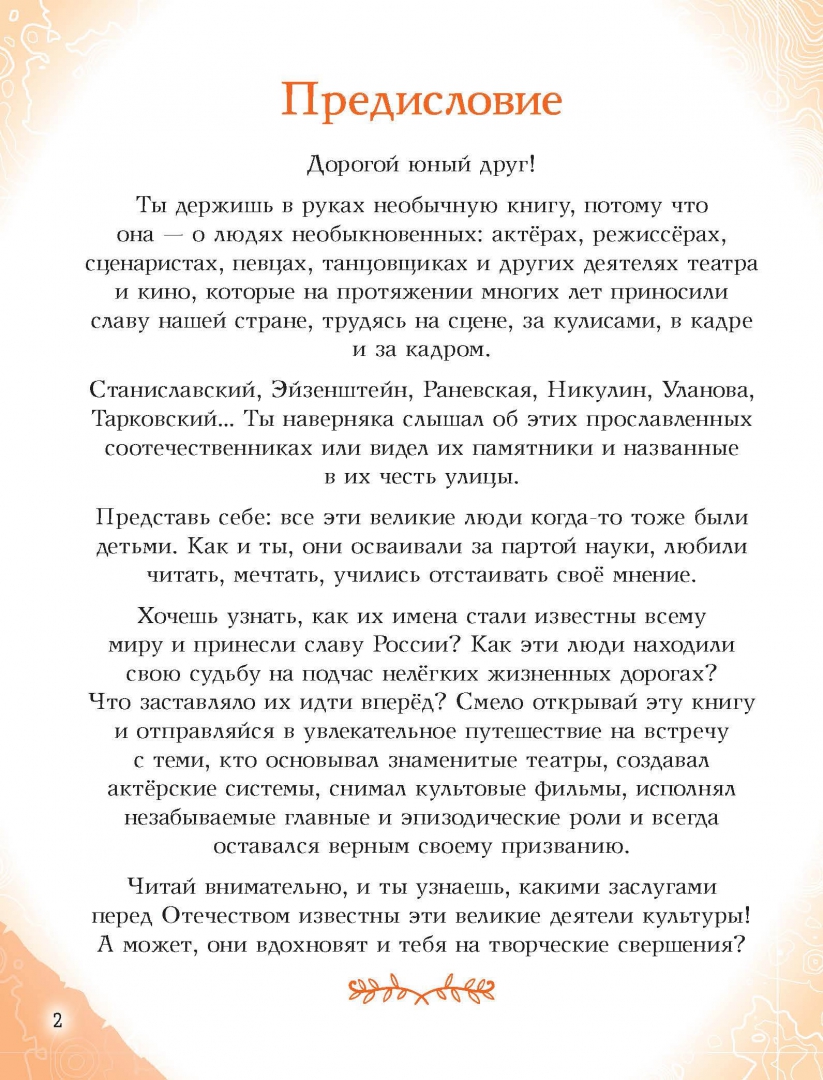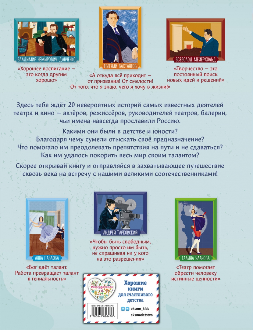 ОписаниеЭта книга патриотической серии "Великие люди великой страны" рассказывает о двадцати наших знаменитых соотечественниках - актёрах, режиссёрах, сценаристах, певцах, танцовщиках и других деятелях театра и кино, чьи имена навсегда останутся в истории России. Кто основал самый первый русский театр? Как цирковой клоун без профессионального образования покорил огромную страну? Какому культовому режиссёру подражают во всём мире?Захватывающие сюжеты в жанре нарративного нонфикшена, исторических "детективов" и "боевиков"! В каждом рассказе - вдохновляющая читателей на собственные свершения история успеха, невероятный пример силы воли и стойкости характера! Динамичные, запоминающиеся, современные, яркие иллюстрации созданы специально для этой книги!Издание предназначено для среднего школьного возраста, однако будет интересно и взрослым, а также станет неповторимым подарком по любому поводу для всех, кто любит Россию и гордится ею. Читайте всей семьёй и узнавайте всё самое интересное о великих людях нашей страны!Для среднего школьного возраста.СвернутьЭта книга патриотической серии "Великие люди великой страны" рассказывает о двадцати наших знаменитых соотечественниках - актёрах, режиссёрах, сценаристах, певцах, танцовщиках и других деятелях театра и кино, чьи имена навсегда останутся в истории России. Кто основал самый первый русский театр? Как цирковой клоун без профессионального образования покорил огромную страну? Какому культовому режиссёру подражают во всём мире?Захватывающие сюжеты в жанре нарративного нонфикшена, исторических "детективов" и "боевиков"! В каждом рассказе - вдохновляющая читателей на собственные свершения история успеха, невероятный пример силы воли и стойкости характера! Динамичные, запоминающиеся, современные, яркие иллюстрации созданы специально для этой книги!Издание предназначено для среднего школьного возраста, однако будет интересно и взрослым, а также станет неповторимым подарком по любому поводу для всех, кто любит Россию и гордится ею. Читайте всей семьёй и узнавайте всё самое интересное о великих людях нашей страны!Для среднего школьного возраста.СвернутьСвернуть