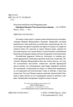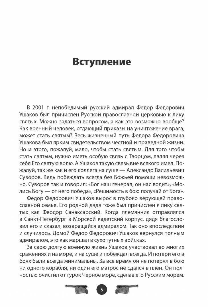 ОписаниеЭта книга повествует о нашем замечательном русском флотоводце Федоре Федоровиче Ушакове. Адмирале, который выиграл все свои морские и сухопутные сражения, да так, что не потерял ни одного корабля, ни один его матрос и солдат не попал в плен. Он очистил от турок Черное море, сделав его Русским морем, хотя турок было в 3 раза больше, а корабли их были быстроходнее наших и более мощными по вооружению.Английский адмирал Нельсон повторял за нашим русским адмиралом Ушаковым приемы морских сражений. Авторитет Федора Федоровича был настолько высок, что турки согласились выступить совместно против французов при условии, что командовать ими будет адмирал Ушаков. Его называли "Суворовым на море" и "Морским медведем" за его дерзкий наступательный стиль и любовь к простым матросам. Русская Православная церковь причислила Ушакова к лику святых за его праведную жизнь и любовь к людям. Такими флотоводцами гордится наша страна.Эта книга повествует о нашем замечательном русском флотоводце Федоре Федоровиче Ушакове. Адмирале, который выиграл все свои морские и сухопутные сражения, да так, что не потерял ни одного корабля, ни один его матрос и солдат не попал в плен. Он очистил от турок Черное море, сделав его Русским морем, хотя турок было в 3 раза больше, а корабли их были быстроходнее наших и более мощными по вооружению.Английский адмирал Нельсон повторял за нашим русским адмиралом Ушаковым приемы морских сражений. Авторитет Федора Федоровича был настолько высок, что турки согласились выступить совместно против французов при условии, что командовать ими будет адмирал Ушаков. Его называли "Суворовым на море" и "Морским медведем" за его дерзкий наступательный стиль и любовь к простым матросам. Русская Православная церковь причислила Ушакова к лику святых за его праведную жизнь и любовь к людям. Такими флотоводцами гордится наша страна.