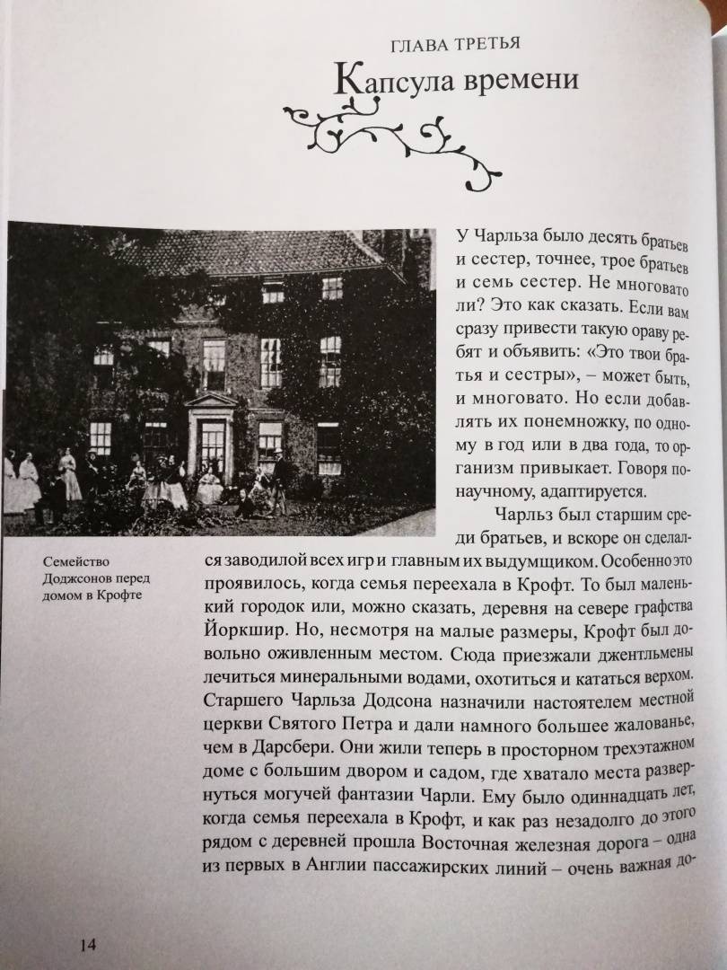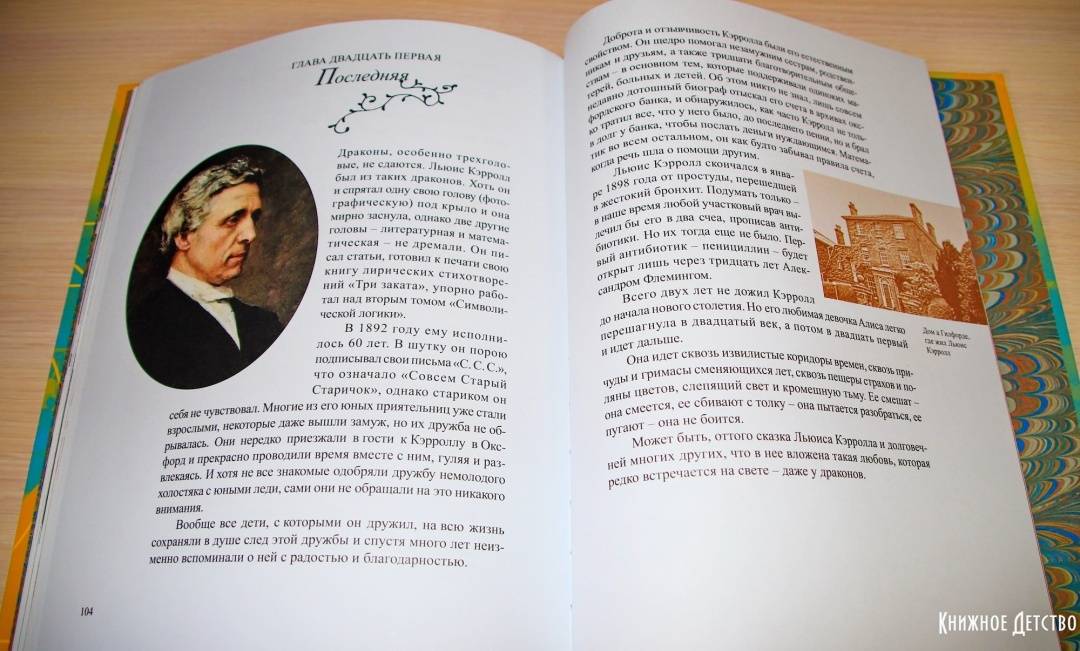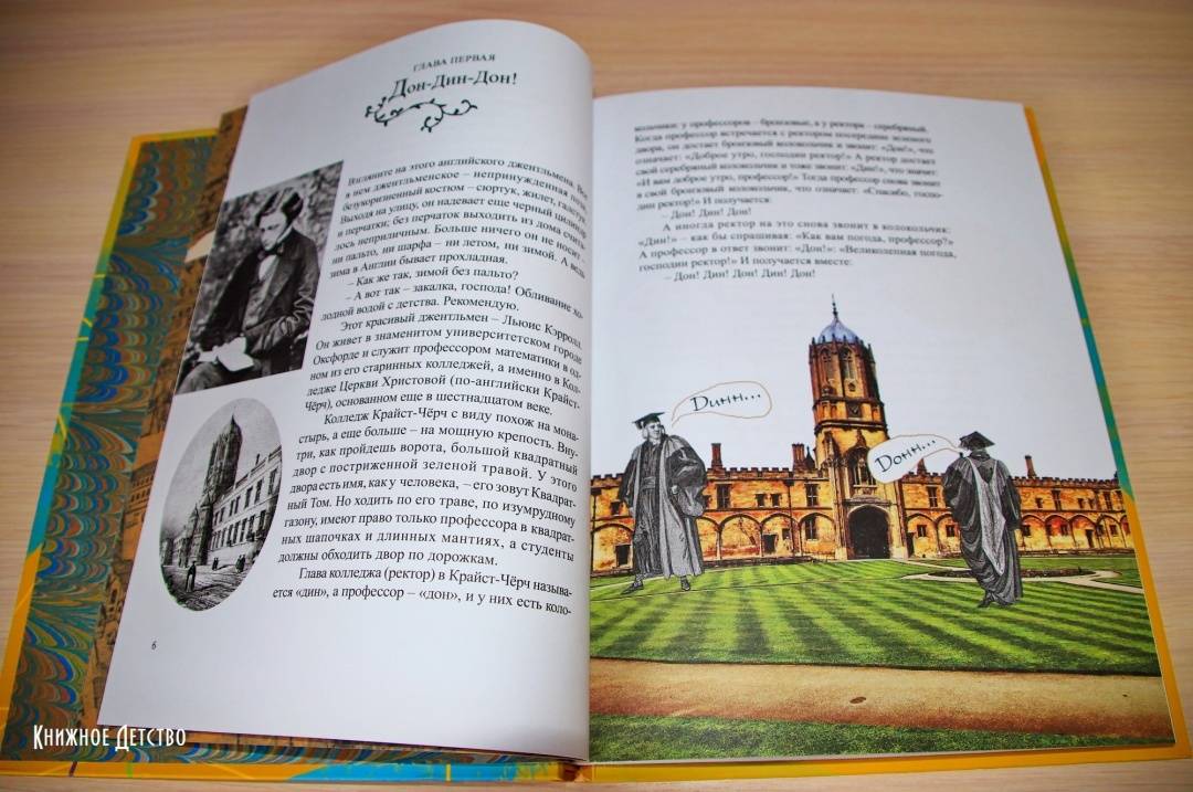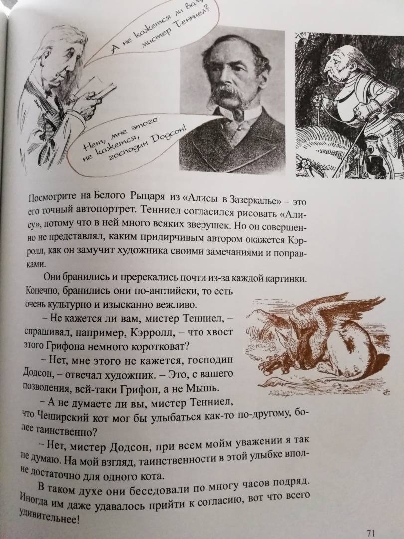 ОписаниеВы, конечно, читали сказку о приключениях Алисы в Стране Чудес - и вторую сказку, где она проходит сквозь зеркало и оказывается в Зазеркалье? И вы, разумеется, помните, как зовут автора этих книг. Не правда ли, даже в его имени есть что-то волшебное - Льюис Кэрролл. Он был профессором математики, а еще сказочником и поэтом, и просто великим выдумщиком мастером придумывать всякие игры и головоломки Он даже изобрел круглый бильярд, в который любил поиграть после вечернего чая вместе со Шляпником и Мартовским Зайцем. Вообще, он любил всё круглое и с детства мечтал отправиться в кругосветное путешествие, чтобы отыскать то место, где СЕГОДНЯ переходит в ЗАВТРА. Но потом понял, что незачем суетиться: ведь даже остановившиеся часы дважды в день показывают верное время. В то время как спешащие часы, если они забегают вперед даже на одну минуту в сутки, верное время покажут только через пять лет. Вот так и автор, который, может быть, потихоньку разыгрывает своего читателя и посмеивается над ним, нет-нет, да и скажет что-нибудь правдивое.Для детей среднего школьного возраста.СвернутьВы, конечно, читали сказку о приключениях Алисы в Стране Чудес - и вторую сказку, где она проходит сквозь зеркало и оказывается в Зазеркалье? И вы, разумеется, помните, как зовут автора этих книг. Не правда ли, даже в его имени есть что-то волшебное - Льюис Кэрролл. Он был профессором математики, а еще сказочником и поэтом, и просто великим выдумщиком мастером придумывать всякие игры и головоломки Он даже изобрел круглый бильярд, в который любил поиграть после вечернего чая вместе со Шляпником и Мартовским Зайцем. Вообще, он любил всё круглое и с детства мечтал отправиться в кругосветное путешествие, чтобы отыскать то место, где СЕГОДНЯ переходит в ЗАВТРА. Но потом понял, что незачем суетиться: ведь даже остановившиеся часы дважды в день показывают верное время. В то время как спешащие часы, если они забегают вперед даже на одну минуту в сутки, верное время покажут только через пять лет. Вот так и автор, который, может быть, потихоньку разыгрывает своего читателя и посмеивается над ним, нет-нет, да и скажет что-нибудь правдивое.Для детей среднего школьного возраста.СвернутьСвернуть
