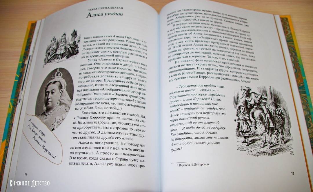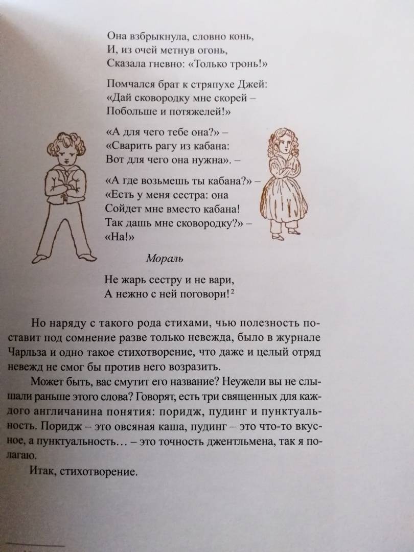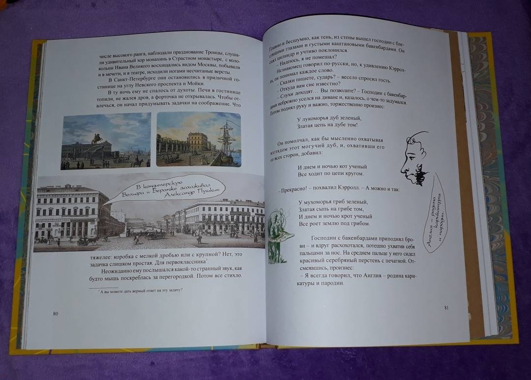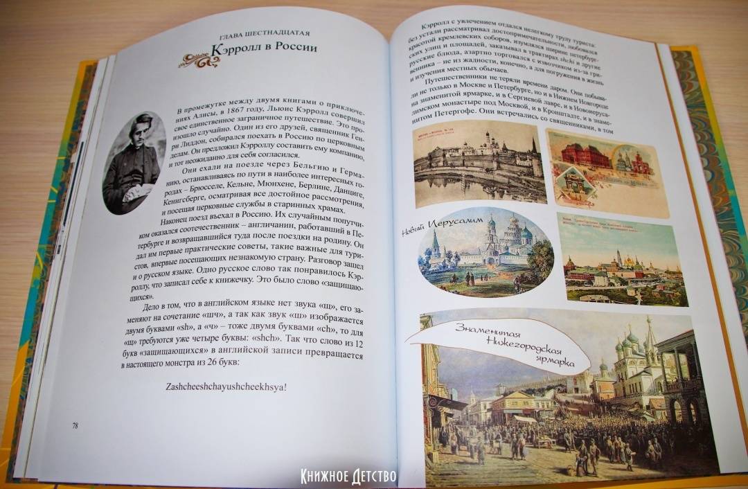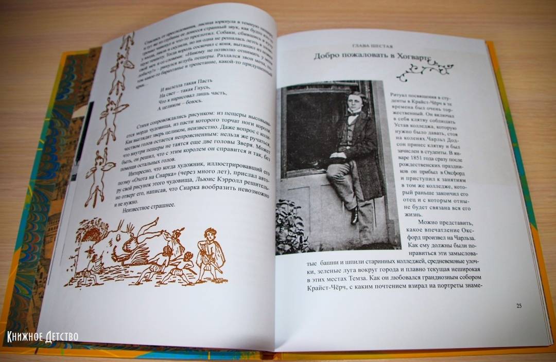 ОписаниеВы, конечно, читали сказку о приключениях Алисы в Стране Чудес - и вторую сказку, где она проходит сквозь зеркало и оказывается в Зазеркалье? И вы, разумеется, помните, как зовут автора этих книг. Не правда ли, даже в его имени есть что-то волшебное - Льюис Кэрролл. Он был профессором математики, а еще сказочником и поэтом, и просто великим выдумщиком мастером придумывать всякие игры и головоломки Он даже изобрел круглый бильярд, в который любил поиграть после вечернего чая вместе со Шляпником и Мартовским Зайцем. Вообще, он любил всё круглое и с детства мечтал отправиться в кругосветное путешествие, чтобы отыскать то место, где СЕГОДНЯ переходит в ЗАВТРА. Но потом понял, что незачем суетиться: ведь даже остановившиеся часы дважды в день показывают верное время. В то время как спешащие часы, если они забегают вперед даже на одну минуту в сутки, верное время покажут только через пять лет. Вот так и автор, который, может быть, потихоньку разыгрывает своего читателя и посмеивается над ним, нет-нет, да и скажет что-нибудь правдивое.Для детей среднего школьного возраста.СвернутьВы, конечно, читали сказку о приключениях Алисы в Стране Чудес - и вторую сказку, где она проходит сквозь зеркало и оказывается в Зазеркалье? И вы, разумеется, помните, как зовут автора этих книг. Не правда ли, даже в его имени есть что-то волшебное - Льюис Кэрролл. Он был профессором математики, а еще сказочником и поэтом, и просто великим выдумщиком мастером придумывать всякие игры и головоломки Он даже изобрел круглый бильярд, в который любил поиграть после вечернего чая вместе со Шляпником и Мартовским Зайцем. Вообще, он любил всё круглое и с детства мечтал отправиться в кругосветное путешествие, чтобы отыскать то место, где СЕГОДНЯ переходит в ЗАВТРА. Но потом понял, что незачем суетиться: ведь даже остановившиеся часы дважды в день показывают верное время. В то время как спешащие часы, если они забегают вперед даже на одну минуту в сутки, верное время покажут только через пять лет. Вот так и автор, который, может быть, потихоньку разыгрывает своего читателя и посмеивается над ним, нет-нет, да и скажет что-нибудь правдивое.Для детей среднего школьного возраста.СвернутьСвернуть