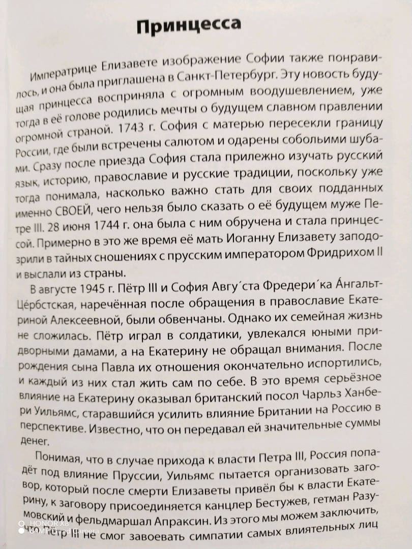 ОписаниеДанная книга продолжает серию "Великие имена России". И как же туда не включить Екатерину Вторую Великую? Само её звание к тому обязывает. Титула "Великий" у нас за свою историю удостоились всего два государя: Пётр I и Екатерина II, и это не случайно, преобразования и результаты правления обоих действительно грандиозны. Но если Пётр поднял своей могучей волей всю Россию как коня на дыбы, то Екатерина правила более тонко, более взвешенно и более терпеливо и добилась своих результатов с гораздо меньшими потерями. А результаты впечатляют: она присоединила к стране Крым, Тамань, Белоруссию и часть Польши, построила на Чёрном море флот и полностью разгромила на нём флот турецкий, провела целый ряд административных и правовых реформ, которые вывели Россию в число передовых стран Европы и заложила фундамент для расцвета российской культуры в XIX веке.Книга предназначена для проведения уроков в школе и полезна для домашнего чтения.Данная книга продолжает серию "Великие имена России". И как же туда не включить Екатерину Вторую Великую? Само её звание к тому обязывает. Титула "Великий" у нас за свою историю удостоились всего два государя: Пётр I и Екатерина II, и это не случайно, преобразования и результаты правления обоих действительно грандиозны. Но если Пётр поднял своей могучей волей всю Россию как коня на дыбы, то Екатерина правила более тонко, более взвешенно и более терпеливо и добилась своих результатов с гораздо меньшими потерями. А результаты впечатляют: она присоединила к стране Крым, Тамань, Белоруссию и часть Польши, построила на Чёрном море флот и полностью разгромила на нём флот турецкий, провела целый ряд административных и правовых реформ, которые вывели Россию в число передовых стран Европы и заложила фундамент для расцвета российской культуры в XIX веке.Книга предназначена для проведения уроков в школе и полезна для домашнего чтения.