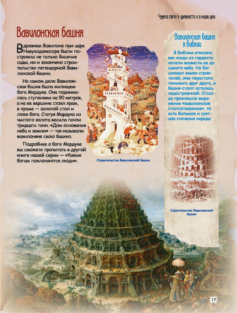 Описание"...Самым знаменитым царем Вавилонского царства был Навуходоносор. Он жил в VI веке до нашей эры. Его жена, мидийская принцесса, скучала по горным лесам далекой родины. Навуходоносор приказал создать леса и цветники прямо посреди шумного Вавилона. Их устроили на высоте 25 метров над землей..."Для детей младшего и среднего школьного возраста.3-е издание, исправленное и дополненное."...Самым знаменитым царем Вавилонского царства был Навуходоносор. Он жил в VI веке до нашей эры. Его жена, мидийская принцесса, скучала по горным лесам далекой родины. Навуходоносор приказал создать леса и цветники прямо посреди шумного Вавилона. Их устроили на высоте 25 метров над землей..."Для детей младшего и среднего школьного возраста.3-е издание, исправленное и дополненное.