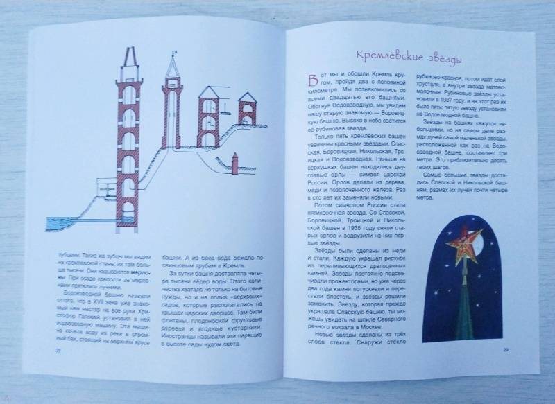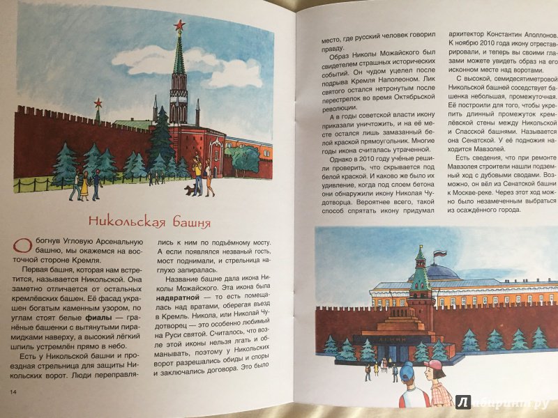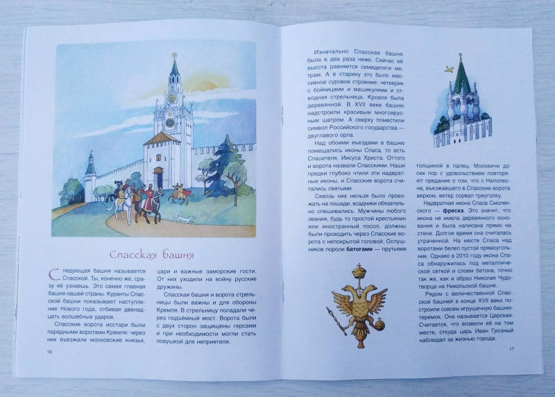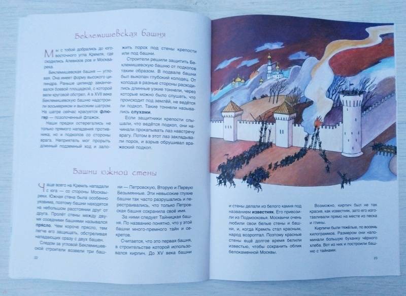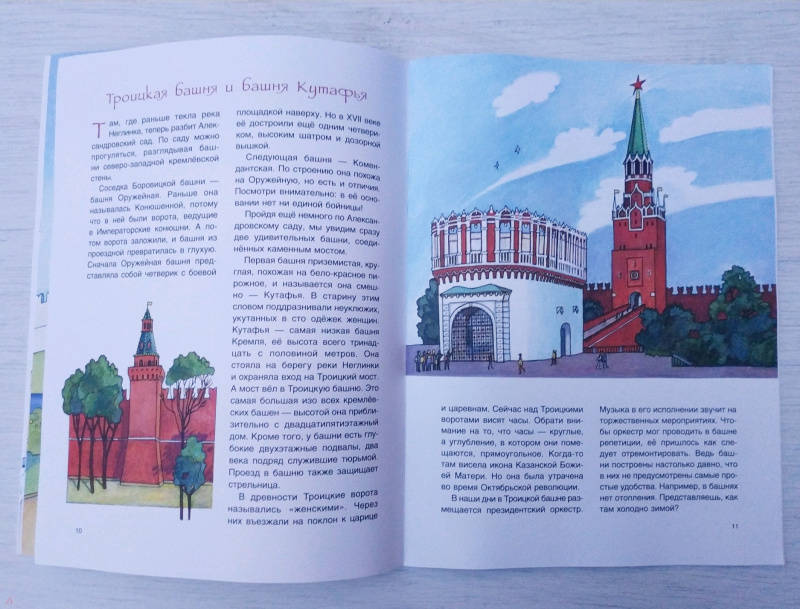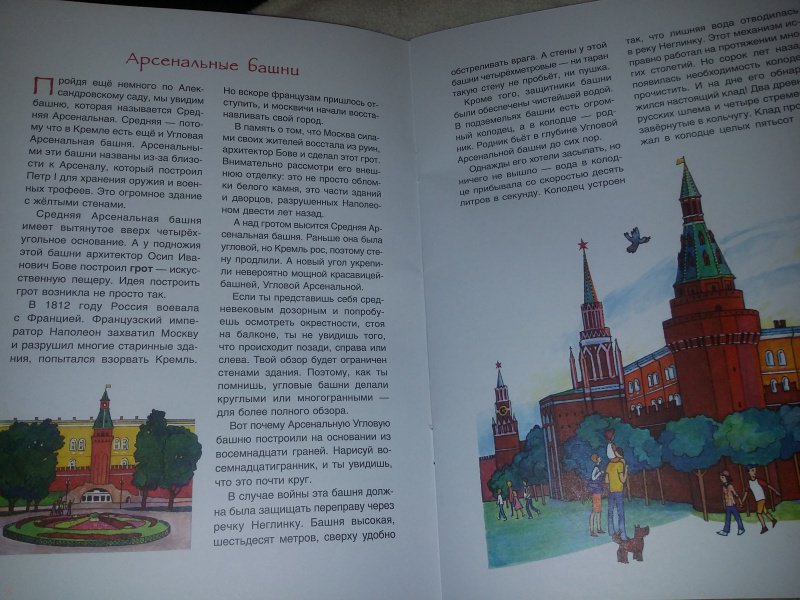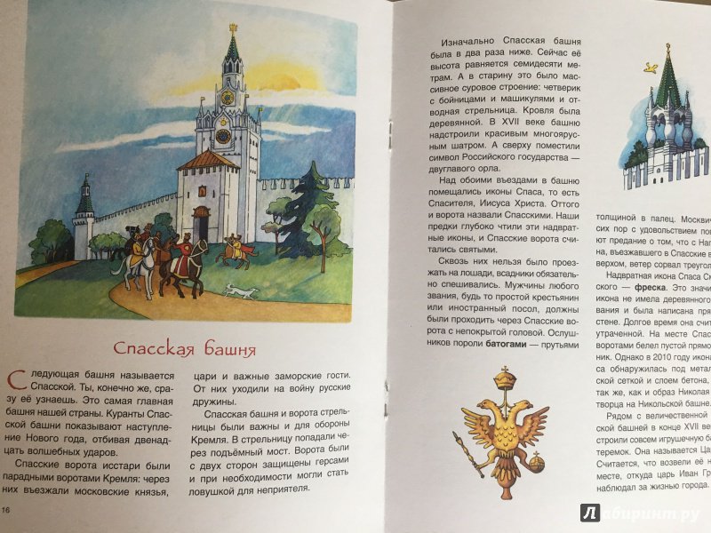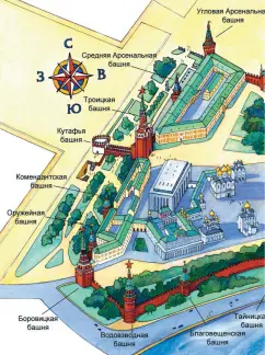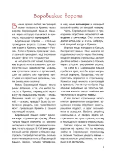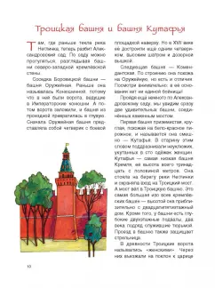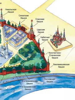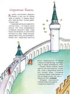 ОписаниеМосковский Кремль - это не только резиденция российского президента, но и самая настоящая средневековая крепость. Давным-давно наши предки поселились на берегу Москвы-реки. Свой крошечный городок они огородили частоколом. Городок рос, у него появились белокаменные башни и стены. Проходили столетия. Каменные стены заменили знакомыми нам кирпичными, а башни стали гораздо выше и красивее. И теперь мы не представляем Москвы без Кремля, а Нового года - без курантов. Днём и ночью над Москвой горят пять рубиновых звёзд на кремлёвских башнях. А всего башен - двадцать, и у каждой есть своя полная тайн и загадок история.Московский Кремль - это не только резиденция российского президента, но и самая настоящая средневековая крепость. Давным-давно наши предки поселились на берегу Москвы-реки. Свой крошечный городок они огородили частоколом. Городок рос, у него появились белокаменные башни и стены. Проходили столетия. Каменные стены заменили знакомыми нам кирпичными, а башни стали гораздо выше и красивее. И теперь мы не представляем Москвы без Кремля, а Нового года - без курантов. Днём и ночью над Москвой горят пять рубиновых звёзд на кремлёвских башнях. А всего башен - двадцать, и у каждой есть своя полная тайн и загадок история.