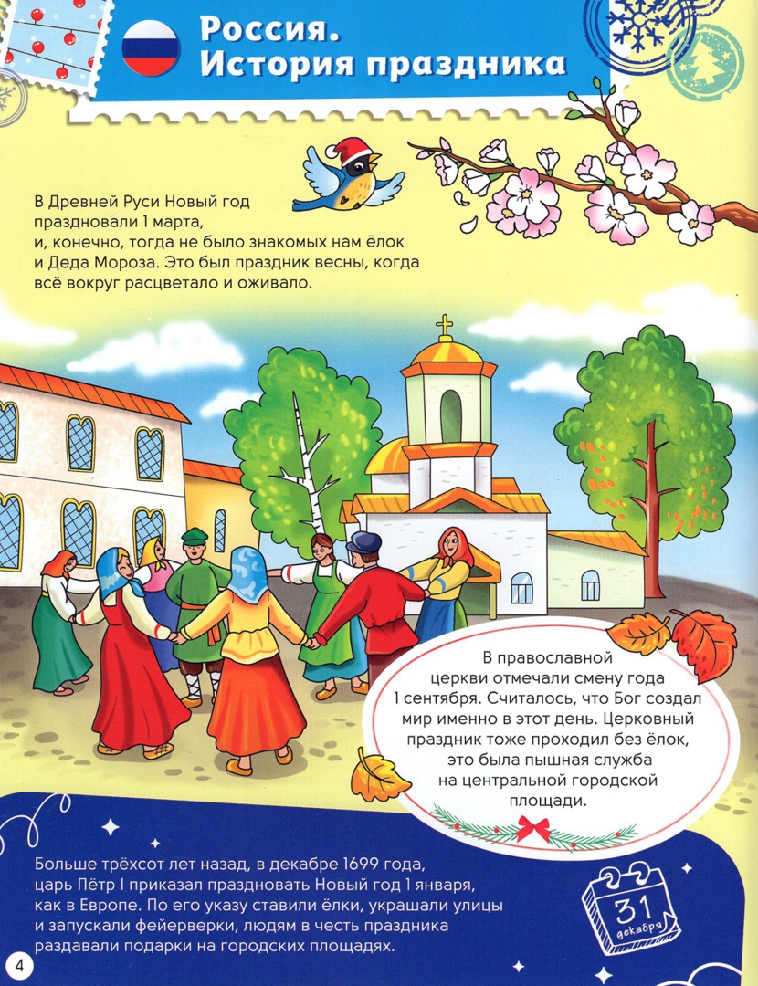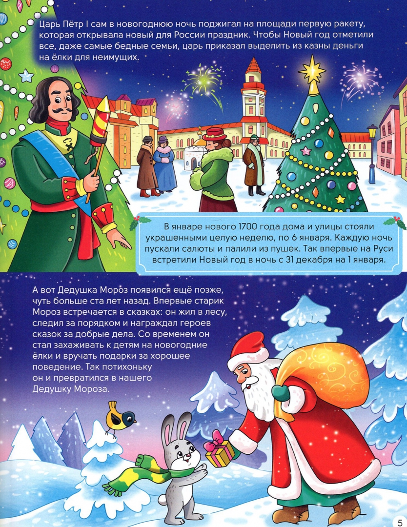 ОписаниеЭнциклопедия познакомит ребёнка с традициями и особенностями празднования Нового года в разных странах мира. Расскажет о том, как в Австралии устраивают новогодние соревнования по серфингу, что в Японии есть три Деда Мороза, а в России были времена, когда ёлки не украшали! Красочные иллюстрации и фотографии позволят окунуться в праздничную атмосферу каждой страны, а викторина в конце книги поможет проверить, насколько хорошо вы запомнили факты про такой разный праздник Новый год.Энциклопедия познакомит ребёнка с традициями и особенностями празднования Нового года в разных странах мира. Расскажет о том, как в Австралии устраивают новогодние соревнования по серфингу, что в Японии есть три Деда Мороза, а в России были времена, когда ёлки не украшали! Красочные иллюстрации и фотографии позволят окунуться в праздничную атмосферу каждой страны, а викторина в конце книги поможет проверить, насколько хорошо вы запомнили факты про такой разный праздник Новый год.