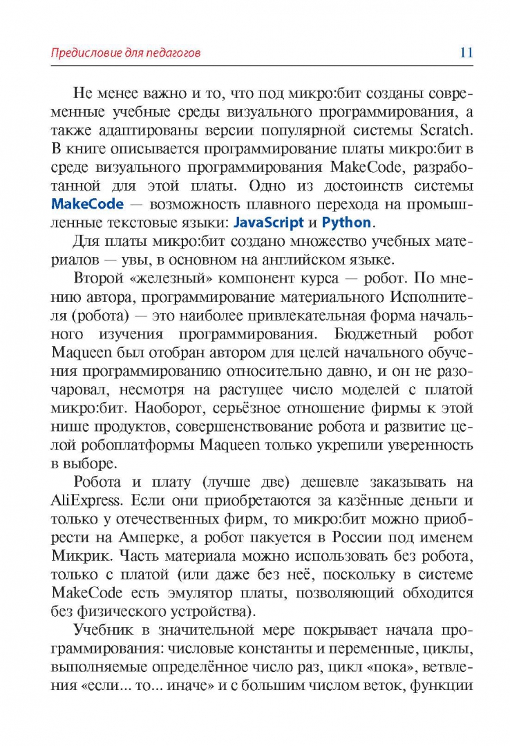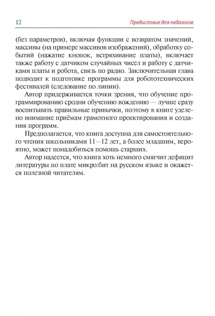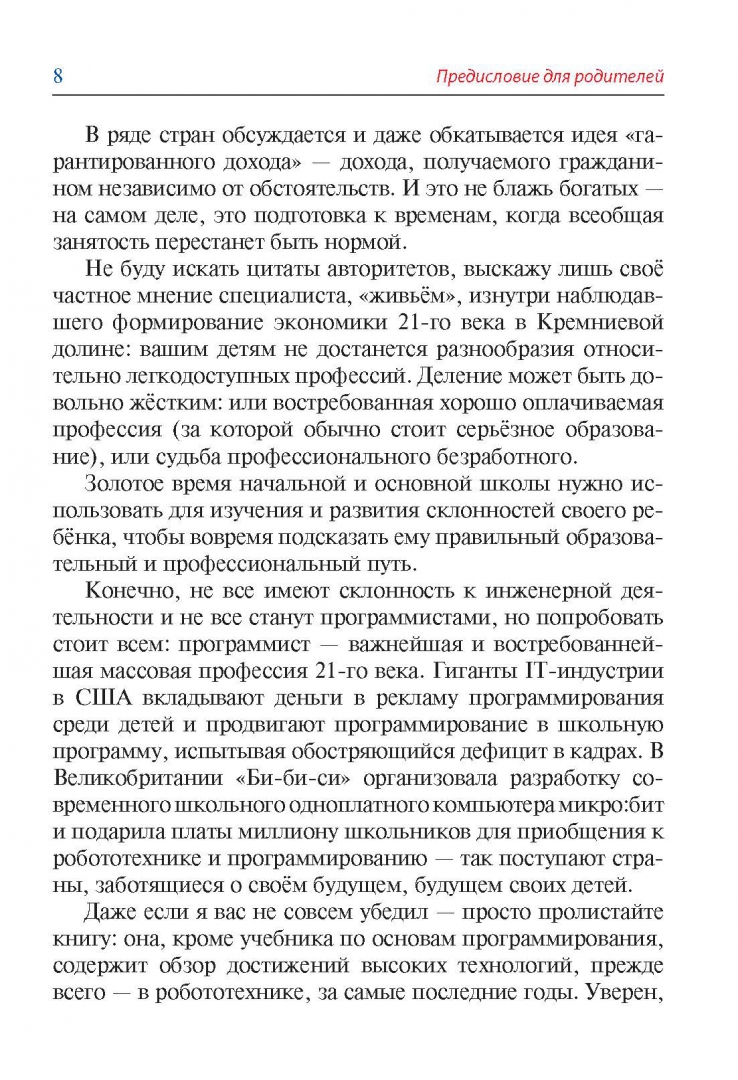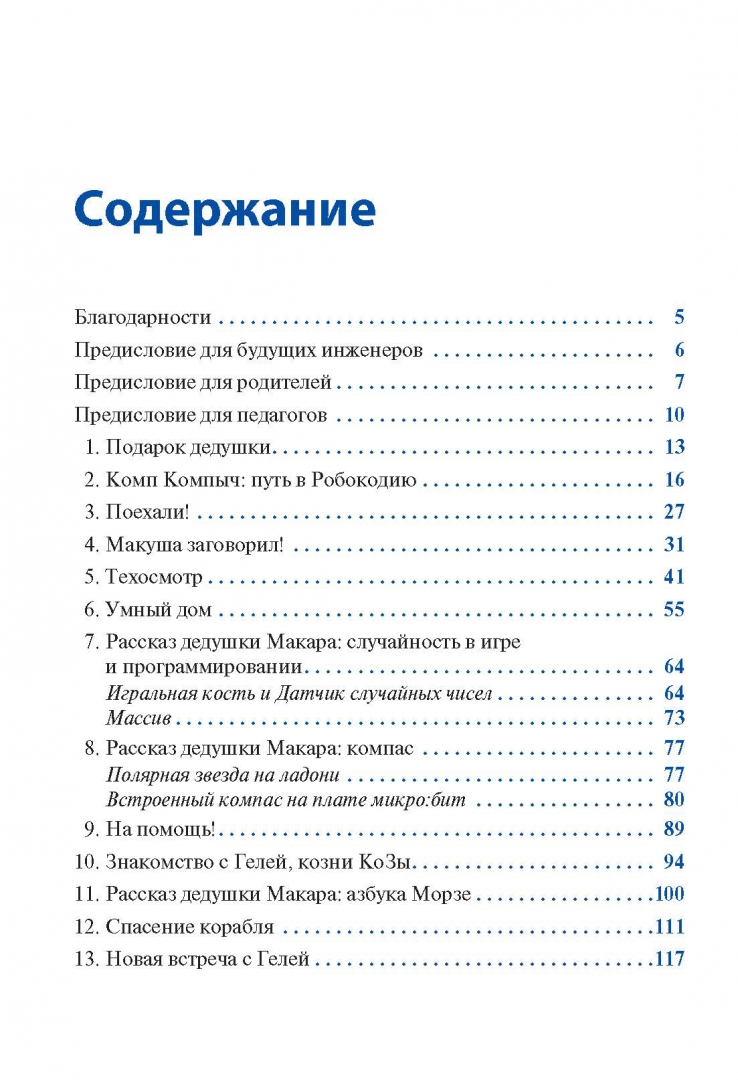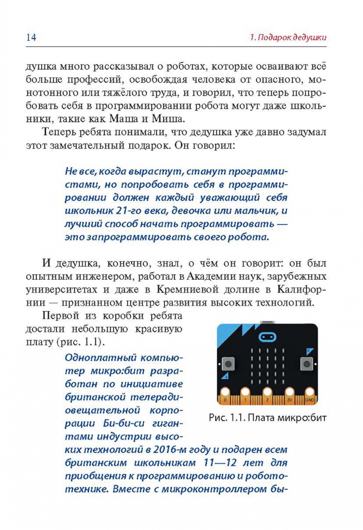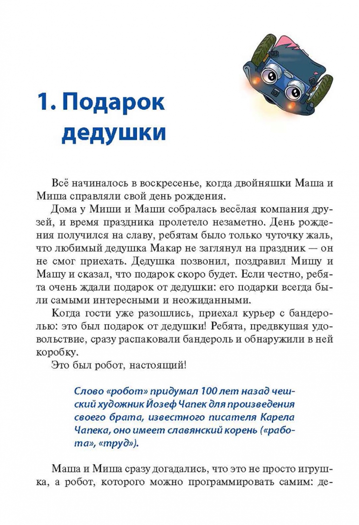 ОписаниеДвойняшки Маша и Миша получают в подарок на день рождения программируемого робота и попадают с ним в страну Робокодию. Приключения в стране роботов раскрывают возможности ожившего робота Макуши (робот Maqueen), которого учатся программировать ребята, и, вместе с ними, читатели книги. На связи с путешественниками - дедушка Макар, готовый помочь разобраться в вопросах программирования. В занимательной форме книга знакомит с основами программирования и робототехники, содержит интересные познавательные факты о современных достижениях робототехники, и не только. Книга - "первая дасточка" на практически пустом поле учебной литературы для современного одноплатного школьного компьютера микро:бит на русском языке (лишь относительно недавно вышло "Официальное руководство пользователя" - переводной справочник по плате микро:бит).Книга предназначена как для самостоятельного чтения школьниками основной и начальной школы, так и для совместного со старшими изучения в кругу семьи или в рамках дополнительного образованияСвернутьДвойняшки Маша и Миша получают в подарок на день рождения программируемого робота и попадают с ним в страну Робокодию. Приключения в стране роботов раскрывают возможности ожившего робота Макуши (робот Maqueen), которого учатся программировать ребята, и, вместе с ними, читатели книги. На связи с путешественниками - дедушка Макар, готовый помочь разобраться в вопросах программирования. В занимательной форме книга знакомит с основами программирования и робототехники, содержит интересные познавательные факты о современных достижениях робототехники, и не только. Книга - "первая дасточка" на практически пустом поле учебной литературы для современного одноплатного школьного компьютера микро:бит на русском языке (лишь относительно недавно вышло "Официальное руководство пользователя" - переводной справочник по плате микро:бит).Книга предназначена как для самостоятельного чтения школьниками основной и начальной школы, так и для совместного со старшими изучения в кругу семьи или в рамках дополнительного образованияСвернутьСвернуть