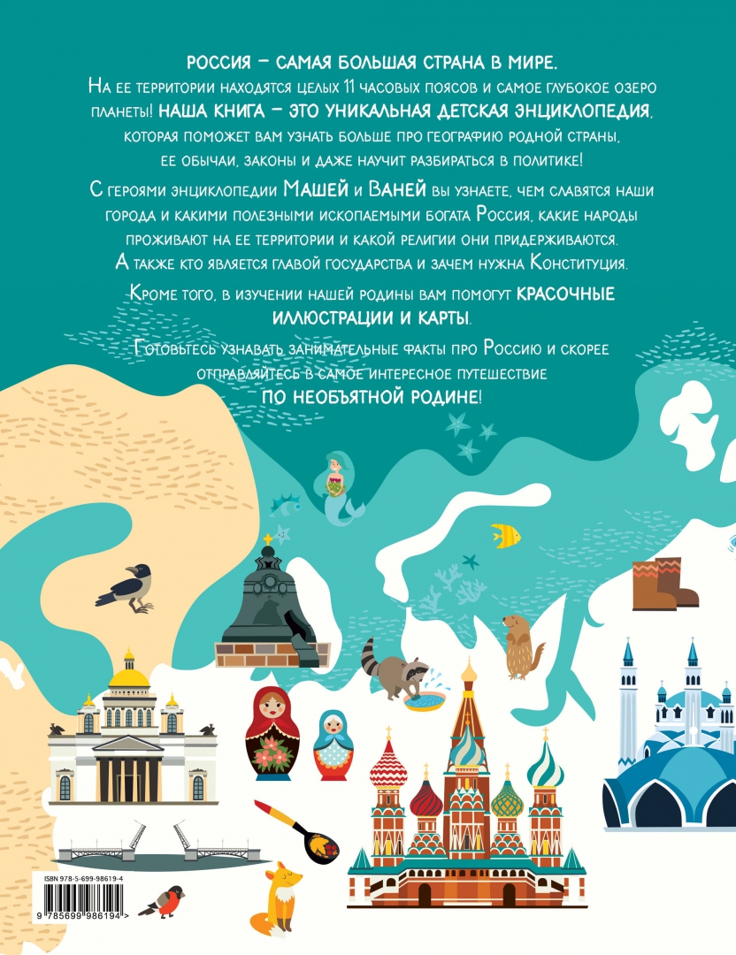 ОписаниеРоссия - великая страна. Отправляйся в путешествие по нашей Родине с ее бескрайними просторами, богатым природным и культурным наследием. Но чтобы постичь всю ее красоту и богатство тебе предстоит преодолеть немало трудностей - победить злодеев и стать настоящим русским богатырем. Ты пройдешь через века и эпохи, чтобы познакомиться с волшебной страной, где ты живешь."Удивительная Россия" - уникальная детская энциклопедия, которая поможет ребенку узнать не только географию любимой страны, но и в ее обычаи, законы и даже политику! С героями книги Машей и Ваней дети узнают, чем славятся наши города и какими полезными ископаемыми богата Россия, какие народы проживают на ее территории и какую религию они исповедают, а также кто является главой государства и зачем нужна Конституция. Энциклопедия написана доступным для ребенка языком и сообщает множество увлекательных и важных фактов, которые помогут ребенку больше узнать о родине!Россия - великая страна. Отправляйся в путешествие по нашей Родине с ее бескрайними просторами, богатым природным и культурным наследием. Но чтобы постичь всю ее красоту и богатство тебе предстоит преодолеть немало трудностей - победить злодеев и стать настоящим русским богатырем. Ты пройдешь через века и эпохи, чтобы познакомиться с волшебной страной, где ты живешь."Удивительная Россия" - уникальная детская энциклопедия, которая поможет ребенку узнать не только географию любимой страны, но и в ее обычаи, законы и даже политику! С героями книги Машей и Ваней дети узнают, чем славятся наши города и какими полезными ископаемыми богата Россия, какие народы проживают на ее территории и какую религию они исповедают, а также кто является главой государства и зачем нужна Конституция. Энциклопедия написана доступным для ребенка языком и сообщает множество увлекательных и важных фактов, которые помогут ребенку больше узнать о родине!