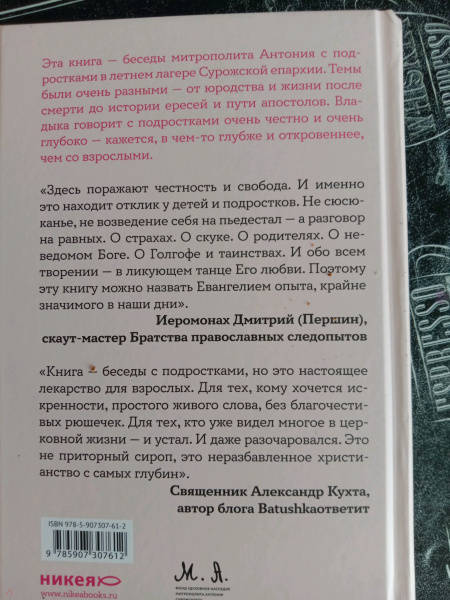 ОписаниеЭта книга - беседы митрополита Антония с подростками в летнем лагере Сурожской епархии. Владыка говорит с ними очень честно и очень глубоко - кажется, в чем-то глубже и откровеннее, чем со взрослыми. О страхах. О скуке. Об агрессии. О юродивых и ересях. О неведомом Боге. О Голгофе и таинствах. И обо всем творении - в ликующем танце Его любви. Поэтому эту книгу можно назвать Евангелием опыта, крайне значимого в наши дни. Даже те, кто давно читает книги митрополита Антония, найдут для себя здесь немало нового и необычного.Эта книга - беседы митрополита Антония с подростками в летнем лагере Сурожской епархии. Владыка говорит с ними очень честно и очень глубоко - кажется, в чем-то глубже и откровеннее, чем со взрослыми. О страхах. О скуке. Об агрессии. О юродивых и ересях. О неведомом Боге. О Голгофе и таинствах. И обо всем творении - в ликующем танце Его любви. Поэтому эту книгу можно назвать Евангелием опыта, крайне значимого в наши дни. Даже те, кто давно читает книги митрополита Антония, найдут для себя здесь немало нового и необычного.