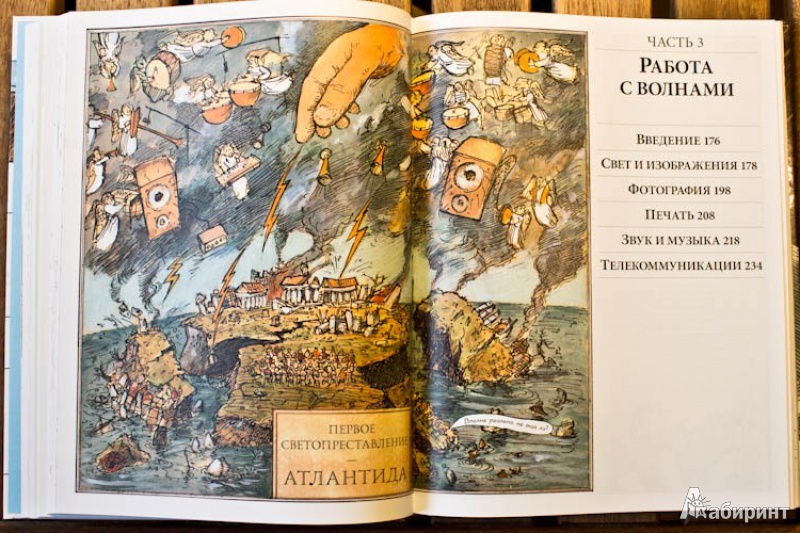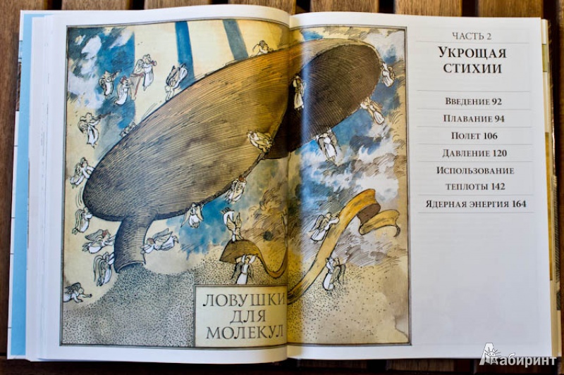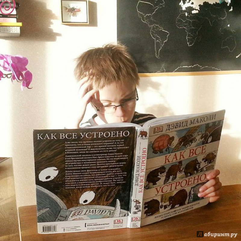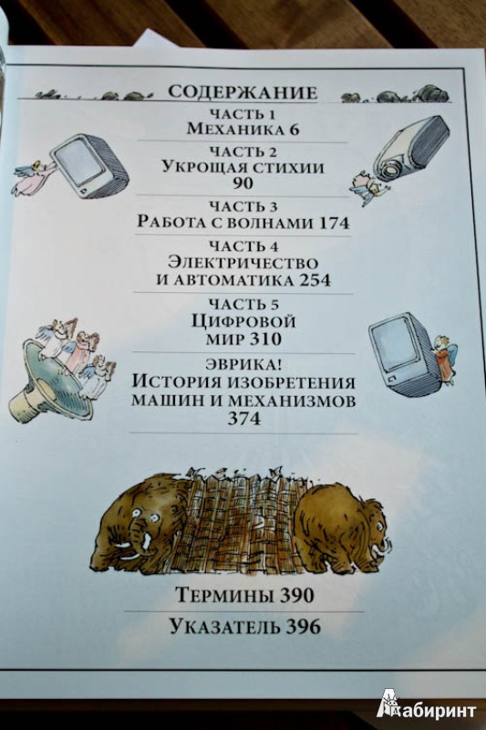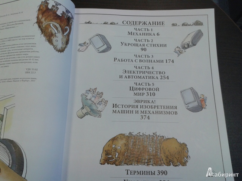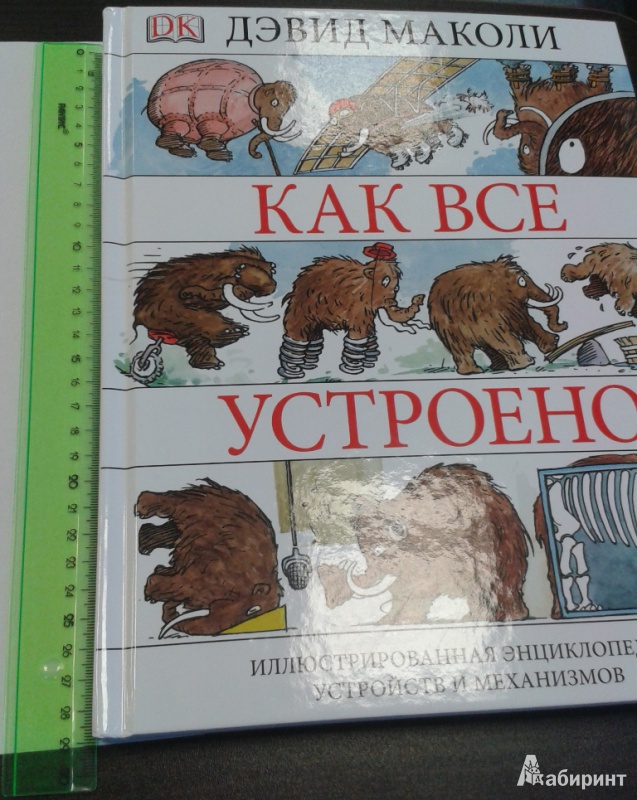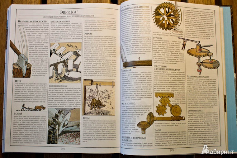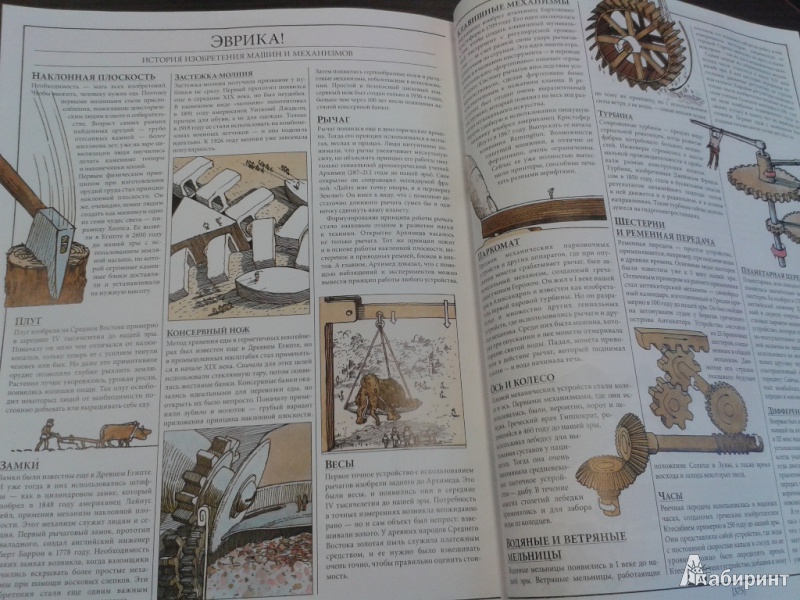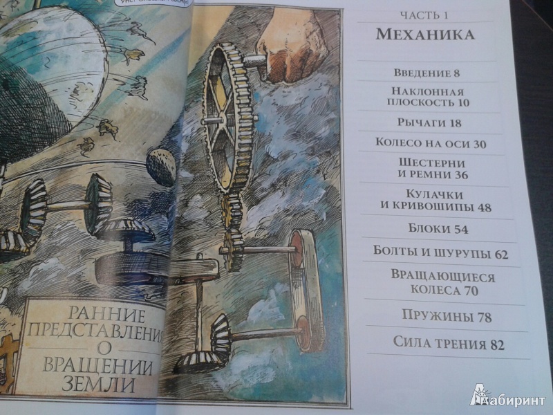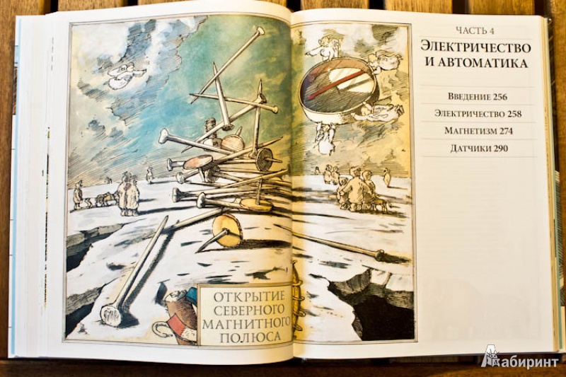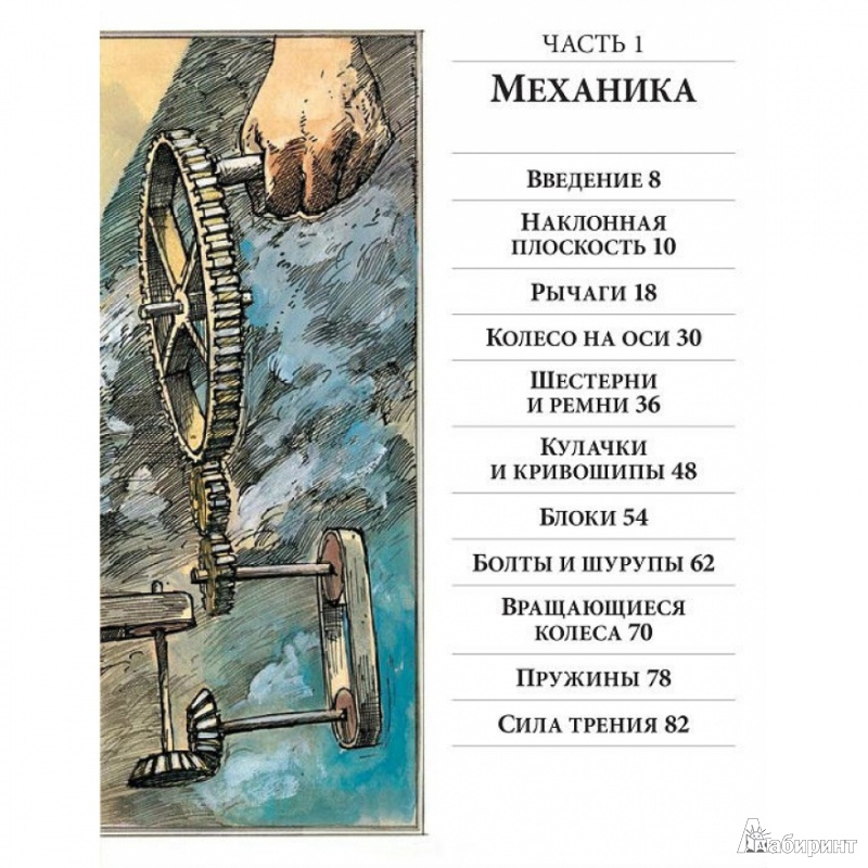 ОписаниеО чем эта книга А вы знали, что застежка-"молния" устроена по тому же принципу, что и стены египетских пирамид? А то, что стоматологический бор - это прямой потомок первой ветряной мельницы? Вы когда-нибудь задумывались о том, что компьютер, выполняя сложнейшие задачи, сначала преобразует информацию в цифровые коды, состоящие "всего лишь" из нулей и единиц? Это лишь малая часть удивительных взаимосвязей между разными на первый взгляд вещами. Задействовав свою фантазию и талант художника на полную катушку, Дэвид Маколи создал потрясающую книгу для всех, кому интересно узнать, как работают разные устройства. Истории, в которые попадает главный герой, мохнатый мамонт, помогают понять сложные технологии даже технически не подкованному читателю. Книга состоит из пяти частей, охватывающих принципы работы сотен механизмов и устройств, созданных человечеством за тысячи лет, от простых до самых сложных: плуг, винт, водопровод, автомобиль, телефон, компьютер, банкомат, водные суда, летательные аппараты, электростанции, печатные машины.... Объединяются они согласно физическим принципам работы, так что можно увидеть глубинную простую суть самых сложных предметов нашего мира. Помимо этого раздел "Эврика" позволяет проследить вкратце историю основных изобретений, а словарь терминов поможет разобраться с понятиями. Для кого эта книга Энциклопедия создавалась для читателей любого возраста, которым обычные книги по физике кажутся сложными. Но особенно интересна и полезна она будет детям 10-12 лет. Помимо доходчивости изложения, она дополняет школьный курс физики: разделы механики, динамики, оптики, акустики станут намного яснее, если параллельно с их изучением (а еще лучше до этого) прочитать эту книгу. Фишки книги В мире куплено более миллиона экземпляров этой книги. Созданная на ее основе еще в 1999 году одноименная интерактивная энциклопедия собрала более десятка премий и была признана лучшей познавательной и обучающей программой всех времен и народов. 2-е издание.СвернутьО чем эта книга А вы знали, что застежка-"молния" устроена по тому же принципу, что и стены египетских пирамид? А то, что стоматологический бор - это прямой потомок первой ветряной мельницы? Вы когда-нибудь задумывались о том, что компьютер, выполняя сложнейшие задачи, сначала преобразует информацию в цифровые коды, состоящие "всего лишь" из нулей и единиц? Это лишь малая часть удивительных взаимосвязей между разными на первый взгляд вещами. Задействовав свою фантазию и талант художника на полную катушку, Дэвид Маколи создал потрясающую книгу для всех, кому интересно узнать, как работают разные устройства. Истории, в которые попадает главный герой, мохнатый мамонт, помогают понять сложные технологии даже технически не подкованному читателю. Книга состоит из пяти частей, охватывающих принципы работы сотен механизмов и устройств, созданных человечеством за тысячи лет, от простых до самых сложных: плуг, винт, водопровод, автомобиль, телефон, компьютер, банкомат, водные суда, летательные аппараты, электростанции, печатные машины.... Объединяются они согласно физическим принципам работы, так что можно увидеть глубинную простую суть самых сложных предметов нашего мира. Помимо этого раздел "Эврика" позволяет проследить вкратце историю основных изобретений, а словарь тер