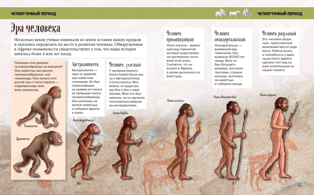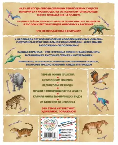 ОписаниеС этой книгой вам не придется ломать голову над объяснениями и формулировками: вся жизнь на Земле, которая существует 4 миллиарда лет, все важные вехи, от первых живых существ до мезозойских монстров, от ледниковых периодов до Красной книги вымирающих видов, от бактерий до человека, разложены «по полочкам» и хорошо запоминаются. Авторы книги Фелиция Ло и Джерри Бэйли известны своими популярными книгами для школьников и подростков. Достоинства книги: это хорошо структурированное издание для читателей младшего и среднего школьного возраста, которое станет для них панорамой нужных знаний, необходимых современному думающему и образованному человеку. Это хорошая база для дальнейшего наращивания знаний об эволюции. Каждая страница книги — это «страница жизни» нашей планеты: в сравнениях, рисунках, схемах и фотографиях. Возможно, вы узнаете и о тех совершенно невероятных вещах, в которые невозможно поверить, а ведь это правда!С этой книгой вам не придется ломать голову над объяснениями и формулировками: вся жизнь на Земле, которая существует 4 миллиарда лет, все важные вехи, от первых живых существ до мезозойских монстров, от ледниковых периодов до Красной книги вымирающих видов, от бактерий до человека, разложены «по полочкам» и хорошо запоминаются. Авторы книги Фелиция Ло и Джерри Бэйли известны своими популярными книгами для школьников и подростков. Достоинства книги: это хорошо структурированное издание для читателей младшего и среднего школьного возраста, которое станет для них панорамой нужных знаний, необходимых современному думающему и образованному человеку. Это хорошая база для дальнейшего наращивания знаний об эволюции. Каждая страница книги — это «страница жизни» нашей планеты: в сравнениях, рисунках, схемах и фотографиях. Возможно, вы узнаете и о тех совершенно невероятных вещах, в которые невозможно поверить, а ведь это правда!