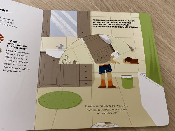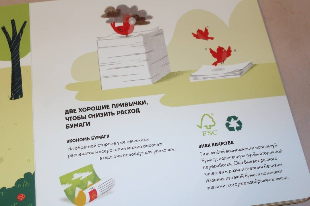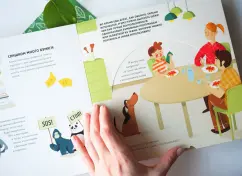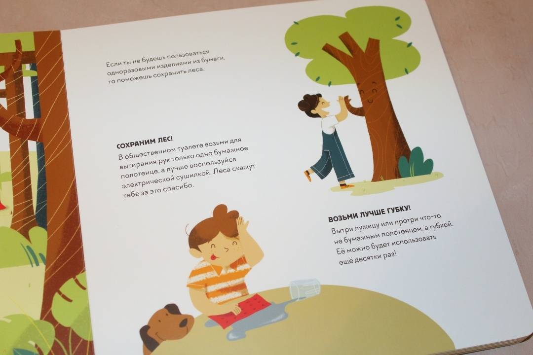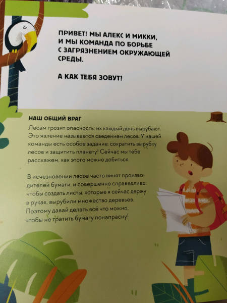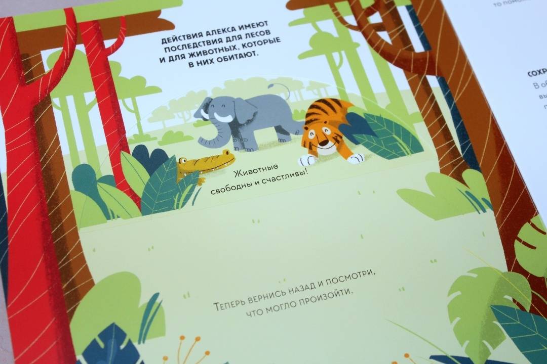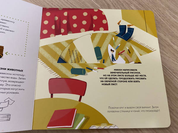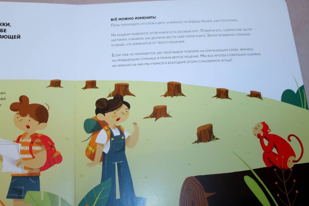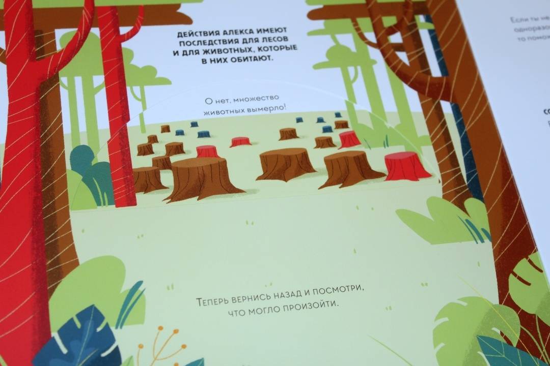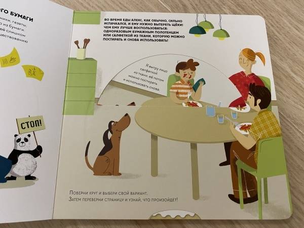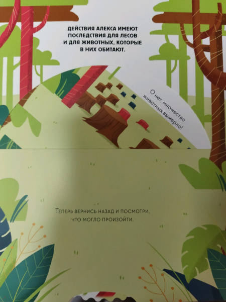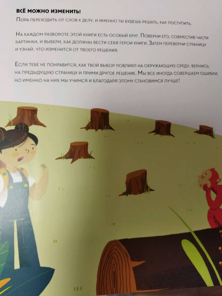 ОписаниеЭта книга-игра научит ребенка думать о том, как наши решения влияют на мир, в котором мы живем. Ребенок узнает, из чего делают бумагу, почему нужно беречь лес и как использовать бумажные изделия повторно.На каждом развороте вы найдете интерактивное колесо: вращая его, ребенок может выбрать один из вариантов решения проблемы, а на следующем развороте оценить результат, понять, как его решение повлияло на окружающую среду. Если произошло что-то плохое, ребенок всегда может извлечь урок из этого опыта и начать все сначала.Из книги ребенок узнает много нового об окружающей среде и о простых способах не тратить бумагу понапрасну - это поможет уберечь лес. Многие лесные животные исчезнут, если леса вырубят, а людям придется дышать грязным воздухом, поэтому так важно заботиться о природе.Фишки книгиИграя с книгой, ребенок учится размышлять, задавать вопросы и подвергать сомнению то, что он видит.Интерактивное колесо - на каждом развороте: ребенок сразу увидит, как его решения влияют на окружающую среду.В книге много идей, как использовать изделия из бумаги повторно. Например, смастерить бусы из страниц журнала или сделать игрушку из втулки туалетной бумаги.Для кого эта книгаДля родителей, которые хотят рассказать детям об экологии, но не знают как.Для детей от 4 лет.Для всех, кто беспокоится о будущем нашей планеты и хочет узнать, как мы можем ей помочь.СвернутьЭта книга-игра научит ребенка думать о том, как наши решения влияют на мир, в котором мы живем. Ребенок узнает, из чего делают бумагу, почему нужно беречь лес и как использовать бумажные изделия повторно.На каждом развороте вы найдете интерактивное колесо: вращая его, ребенок может выбрать один из вариантов решения проблемы, а на следующем развороте оценить результат, понять, как его решение повлияло на окружающую среду. Если произошло что-то плохое, ребенок всегда может извлечь урок из этого опыта и начать все сначала.Из книги ребенок узнает много нового об окружающей среде и о простых способах не тратить бумагу понапрасну - это поможет уберечь лес. Многие лесные животные исчезнут, если леса вырубят, а людям придется дышать грязным воздухом, поэтому так важно заботиться о природе.Фишки книгиИграя с книгой, ребенок учится размышлять, задавать вопросы и подвергать сомнению то, что он видит.Интерактивное колесо - на каждом развороте: ребенок сразу увидит, как его решения влияют на окружающую среду.В книге много идей, как использовать изделия из бумаги повторно. Например, смастерить бусы из страниц журнала или сделать игрушку из втулки туалетной бумаги.Для кого эта книгаДля родителей, которые хотят рассказать детям об экологии, но не знают как.Для детей от 4 лет.Для всех, кто беспокоится о будущем нашей планеты и хочет узнать, как мы можем ей помочь.СвернутьСвернуть