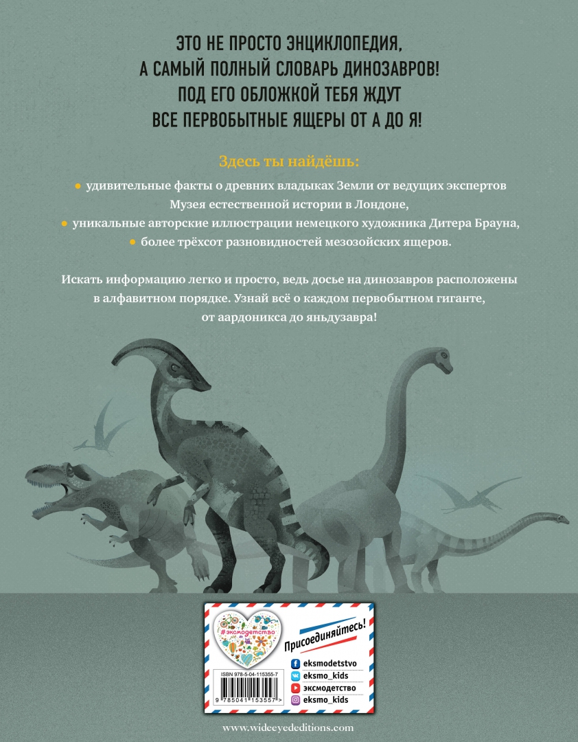 ОписаниеСамый полный словарь динозавров! Все первобытные ящеры от А до Я! Эта книга откроет поистине невероятнейшие тайны доисторических хозяев нашей планеты. Какой древний исполин не переставал расти в течение всей своей жизни? Кто из травоядных динозавров мог дать отпор даже ужасному хищнику аллозавру? Укус какого мезозойского ящера был втрое мощнее укуса современного льва? Существовали ли динозавры размером с курицу? Кто из ящеров и чем походил на сегодняшнюю птицу эму? Издание даст ответы на эти и многие другие вопросы об удивительных динозаврах, а неповторимые иллюстрации художника Дитера Брауна дадут ребятам возможность разглядеть каждого первобытного гиганта во всех подробностях!Словарь предназначен для детей младшего и среднего школьного возраста.• Потрясающие факты о древних ящерах от ведущих экспертов Музея естественной истории в Лондоне!