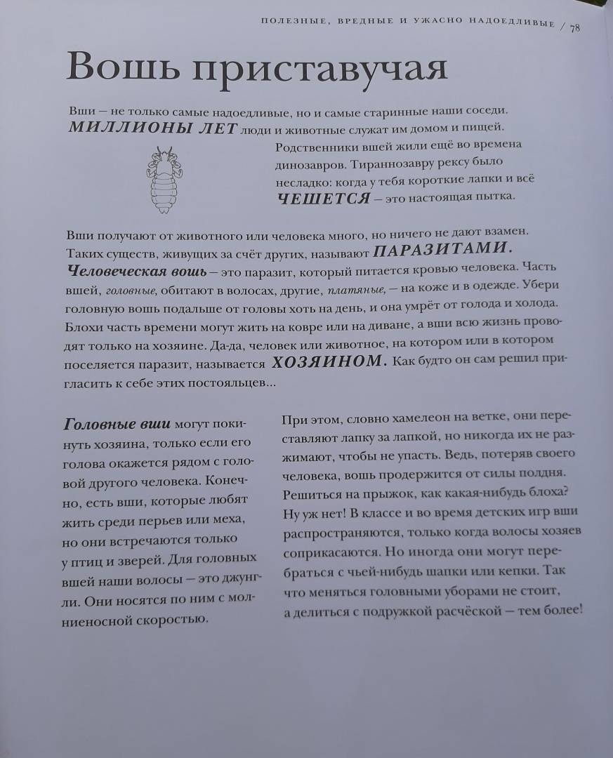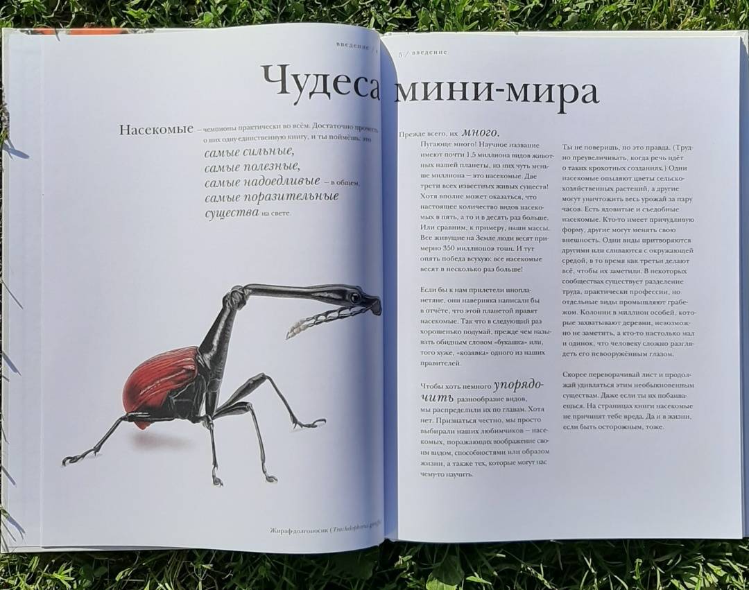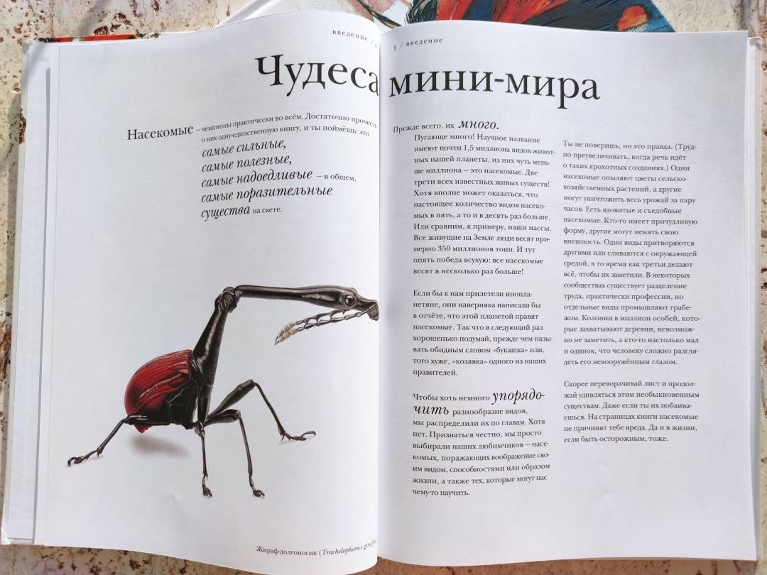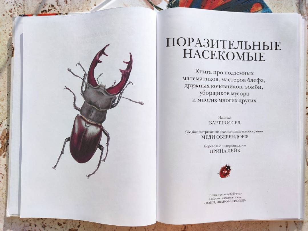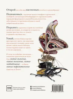 ОписаниеО книгеС этой книгой вы откроете для себя мир насекомых во всем его разнообразии.В этих маленьких существах поразительно все - от внутреннего строения до поведения. Вот несколько интересных фактов из книги:- сестры в пчелином улье относятся друг к другу лучше, чем к собственным детям;- волк в овечьей шкуре действительно существует;- светиться от любви - это не образное выражение;- под водой можно дышать, не имея жабр;- ветки иногда оживают;- некоторые насекомые-умельцы играют на барабанах и цимбалах без инструментов.В мире насекомых все это - обычное дело. Вместе с автором и художником книги вы проникнете в этот мини-мир, а пройдя по всем кусочкам текста, похожим на сегменты насекомого, удивитесь и, может быть, возьмете себе что-то на вооружение. Насекомые - чемпионы практически во всем. Достаточно прочесть о них одну-единственную книгу, и вы поймёте, что это самые сильные, самые полезные, самые надоедливые - в общем, самые поразительные существа на свете.Животный мир, и особенно мир насекомых, может быть жестоким и опасным. Такова дикая природа. На всякий случай отметим, что в книге есть глава про насекомых-трупоедов с иллюстрацией мертвой птицы и глава про медленное убийство таракана тараканьей осой. Лучше эти главы прочитать с ребенком и вместе обсудить прочитанное.Для кого эта книгаДля детей от 5 лет.Об автореБарт Россел - бельгийский ученый-биоинженер, изобретатель, предприниматель и папа трех неукротимых дочерей. Чтобы дать этим дочерям хорошее образование, он рассказывает им впечатляющие, но правдивые истории. Чаще всего о науке, людях, природе и изобретениях.СвернутьО книгеС этой книгой вы откроете для себя мир насекомых во всем его разнообразии.В этих маленьких существах поразительно все - от внутреннего строения до поведения. Вот несколько интересных фактов из книги:- сестры в пчелином улье относятся друг к другу лучше, чем к собственным детям;- волк в овечьей шкуре действительно существует;- светиться от любви - это не образное выражение;- под водой можно дышать, не имея жабр;- ветки иногда оживают;- некоторые насекомые-умельцы играют на барабанах и цимбалах без инструментов.В мире насекомых все это - обычное дело. Вместе с автором и художником книги вы проникнете в этот мини-мир, а пройдя по всем кусочкам текста, похожим на сегменты насекомого, удивитесь и, может быть, возьмете себе что-то на вооружение. Насекомые - чемпионы практически во всем. Достаточно прочесть о них одну-единственную книгу, и вы поймёте, что это самые сильные, самые полезные, самые надоедливые - в общем, самые поразительные существа на свете.Животный мир, и особенно мир насекомых, может быть жестоким и опасным. Такова дикая природа. На всякий случай отметим, что в книге есть глава про насекомых-трупоедов с иллюстрацией мертвой птицы и глава про медленное убийство таракана тараканьей осой. Лучше эти главы прочитать с ребенком и вместе обсудить прочитанное.Для кого эта книгаДля детей от 5 лет.Об автореБарт Россел - бельгийский ученый-биоинженер, изобретатель, предприниматель и папа трех неукротимых дочерей. Чтобы дать этим дочерям хорошее образование, он рассказывает им впечатляющие, но правдивые истории. Чаще всего о науке, людях, природе и изобретениях.СвернутьСвернуть