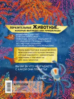Свернуть"Поразительные животные, которые выглядят как пришельцы" - это книга о невероятных животных, которые живут среди нас. Некоторые из них могут выживать в самых экстремальных условиях, другие способны делиться на множество частей, а некоторые вообще бессмертны!Книга оформлена в виде бортового журнала космического исследователя. Он путешествует по планетам в далёком космосе и однажды прилетает на ту, что кажется ему особенно невероятной.Виды животных, которые встречаются ему во время исследования, он тщательно документирует, записывает их особенности и невероятные способности. Неужели эти поразительные животные существуют в действительности?Увлекательная и весёлая книга подарит читателям множество радостных минут, познакомит с миром животных и расскажет о том, как важно беречь планету.Для среднего школьного возраста.Крошечные существа с прозрачной кожей,