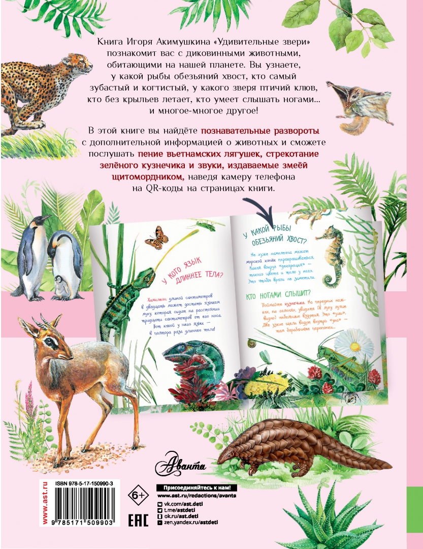 ОписаниеКнига Игоря Ивановича Акимушкина "Удивительные звери" познакомит вас с диковинными животными, обитающими на нашей планете. Вы узнаете, у какого зверя есть птичий клюв, у кого дом из воздуха, чем ягуар от леопарда отличается, где живёт гривистый волк. Между рассказами есть познавательные развороты с интересными фактами о животных и QR-коды, с помощью которых можно послушать тропических лягушек, кузнечика и змею щитомордника. В сборник вошли рассказы из циклов "Это всё собаки", "Это всё кошки", "Это всё антилопы" и рассказы-загадки из книги "Кто без крыльев летает". Для младшего школьного возраста.Книга Игоря Ивановича Акимушкина "Удивительные звери" познакомит вас с диковинными животными, обитающими на нашей планете. Вы узнаете, у какого зверя есть птичий клюв, у кого дом из воздуха, чем ягуар от леопарда отличается, где живёт гривистый волк. Между рассказами есть познавательные развороты с интересными фактами о животных и QR-коды, с помощью которых можно послушать тропических лягушек, кузнечика и змею щитомордника. В сборник вошли рассказы из циклов "Это всё собаки", "Это всё кошки", "Это всё антилопы" и рассказы-загадки из книги "Кто без крыльев летает". Для младшего школьного возраста.