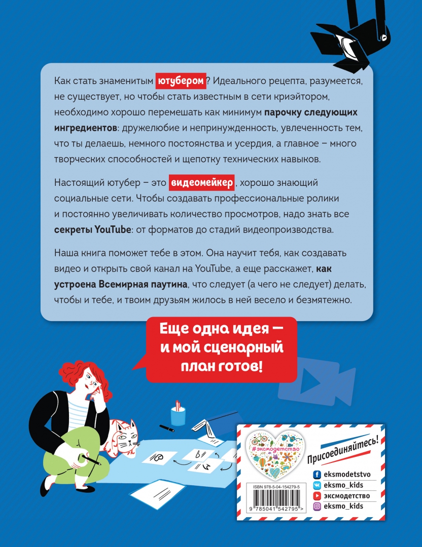 ОписаниеКак стать знаменитым криэйтором? Идеального рецепта, разумеется, не существует, но, чтобы стать более или менее известным в сети ютубером, необходимо хорошо перемешать как минимум парочку следующих ингредиентов: дружелюбие и непринужденность, увлеченность тем, что ты делаешь, немного постоянства и усердия, а главное, много творческих способностей и щепотку технических навыков.Дело в том, что настоящий ютубер - это видеомейкер, хорошо знающий социальные сети. Чтобы делать профессиональные ролики и постоянно увеличивать количество просмотров, надо знать все секреты ютуба, от форматов до стадий видеопроизводства.Для этого и написано наше руководство. Оно научит тебя, как создавать видео и открыть свой канал в YouTube, а еще расскажет, как устроена всемирная паутина, что надо (или не надо) делать, чтобы и тебе, и твоим друзьям жилось в ней весело и безмятежно.Еще одна идея - и мой сценарный план готов!Для детей среднего школьного возраста.Как стать знаменитым криэйтором? Идеального рецепта, разумеется, не существует, но, чтобы стать более или менее известным в сети ютубером, необходимо хорошо перемешать как минимум парочку следующих ингредиентов: дружелюбие и непринужденность, увлеченность тем, что ты делаешь, немного постоянства и усердия, а главное, много творческих способностей и щепотку технических навыков.Дело в том, что настоящий ютубер - это видеомейкер, хорошо знающий социальные сети. Чтобы делать профессиональные ролики и постоянно увеличивать количество просмотров, надо знать все секреты ютуба, от форматов до стадий видеопроизводства.Для этого и написано наше руководство. Оно научит тебя, как создавать видео и открыть свой канал в YouTube, а еще расскажет, как устроена всемирная паутина, что надо (или не надо) делать, чтобы и тебе, и твоим друзьям жилось в ней весело и безмятежно.Еще одна идея - и мой сценарный план готов!Для детей среднего школьного возраста.