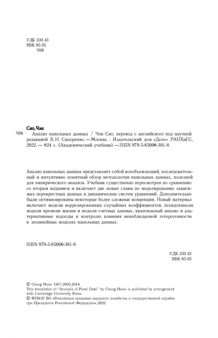 ОписаниеАнализ панельных данных представляет собой всеобъемлющий, последовательный и интуитивно понятный обзор методологии панельных данных, полезных для эмпирического анализа. Учебник существенно пересмотрен по сравнению со вторым изданием и включает две новые главы по моделированию зависимых перекрестных данных и динамических систем уравнений. Дополнительно были оптимизированы некоторые более сложные концепции. Новый материал включает модели коррелированных случайных коэффициентов, псевдопанели, модели времени жизни и модели счетных данных, квантильный анализ и альтернативные подходы к контролю влияния ненаблюдаемой гетерогенности в нелинейных моделях панельных данных.Анализ панельных данных представляет собой всеобъемлющий, последовательный и интуитивно понятный обзор методологии панельных данных, полезных для эмпирического анализа. Учебник существенно пересмотрен по сравнению со вторым изданием и включает две новые главы по моделированию зависимых перекрестных данных и динамических систем уравнений. Дополнительно были оптимизированы некоторые более сложные концепции. Новый материал включает модели коррелированных случайных коэффициентов, псевдопанели, модели времени жизни и модели счетных данных, квантильный анализ и альтернативные подходы к контролю влияния ненаблюдаемой гетерогенности в нелинейных моделях панельных данных.