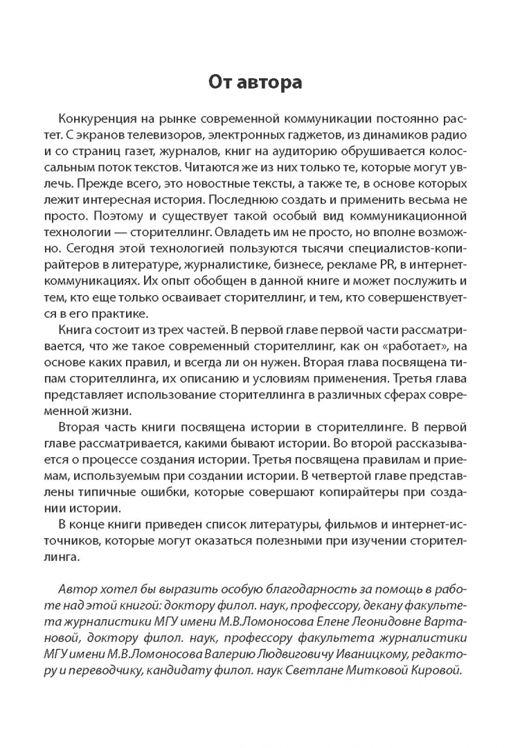 ОписаниеСегодня мир общения стал очень сложным. Непросто пробиться сквозь колоссальный информационный шум к своей аудитории, и очень сложно добиться ее интереса, расположения. Современной коммуникации, эффективному воздействию на слушателей, зрителей, читателей, пользователей помогает сторителлинг. Эта коммуникационная технология все больше развивается и применяется в 21 веке. Ей и посвящена данная книга. Она будет полезна как копирайтерам-практикам, так и студентам и преподавателям ВУЗов, в которых изучается современная коммуникация.Сегодня мир общения стал очень сложным. Непросто пробиться сквозь колоссальный информационный шум к своей аудитории, и очень сложно добиться ее интереса, расположения. Современной коммуникации, эффективному воздействию на слушателей, зрителей, читателей, пользователей помогает сторителлинг. Эта коммуникационная технология все больше развивается и применяется в 21 веке. Ей и посвящена данная книга. Она будет полезна как копирайтерам-практикам, так и студентам и преподавателям ВУЗов, в которых изучается современная коммуникация.