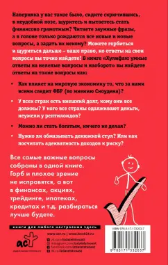 ОписаниеНаверняка у вас такое было, сидите скрючившись, в неудобной позе, щуритесь и пытаетесь стать финансово грамотным? Читаете заумные фразы, а в голове только рождаются все новые и новые вопросы, а задать их некому? Можете горбиться и щуриться дальше - ваше право, но ответы на свои вопросы вы точно найдете! В книге "Хулифак: умные ответы на нелепые вопросы и наоборот" вы найдете ответы на такие вопросы как:- Как влияет на мировую экономику то, что за нами всеми следит ФБР (по мнению Сноудена)? - У всех стран есть внешний долг, кому они все должны? У кого все страны одалживают деньги, неужели у рептилоидов? - Можно ли стать богатым, ничего не делая? - Нужно ли обмазывать денюжкой стул? Или как посчитать адекватность доходов к риску?Все самые важные вопросы собраны в одной книге. Горб и плохое зрение не исправятся, а вот в финансах, акциях, трейдинге, ипотеках, кредитах и т.д. разбираться лучше будете.Наверняка у вас такое было, сидите скрючившись, в неудобной позе, щуритесь и пытаетесь стать финансово грамотным? Читаете заумные фразы, а в голове только рождаются все новые и новые вопросы, а задать их некому? Можете горбиться и щуриться дальше - ваше право, но ответы на свои вопросы вы точно найдете! В книге "Хулифак: умные ответы на нелепые вопросы и наоборот" вы найдете ответы на такие вопросы как:- Как влияет на мировую экономику то, что за нами всеми следит ФБР (по мнению Сноудена)? - У всех стран есть внешний долг, кому они все должны? У кого все страны одалживают деньги, неужели у рептилоидов? - Можно ли стать богатым, ничего не делая? - Нужно ли обмазывать денюжкой стул? Или как посчитать адекватность доходов к риску?Все самые важные вопросы собраны в одной книге. Горб и плохое зрение не исправятся, а вот в финансах, акциях, трейдинге, ипотеках, кредитах и т.д. разбираться лучше будете.