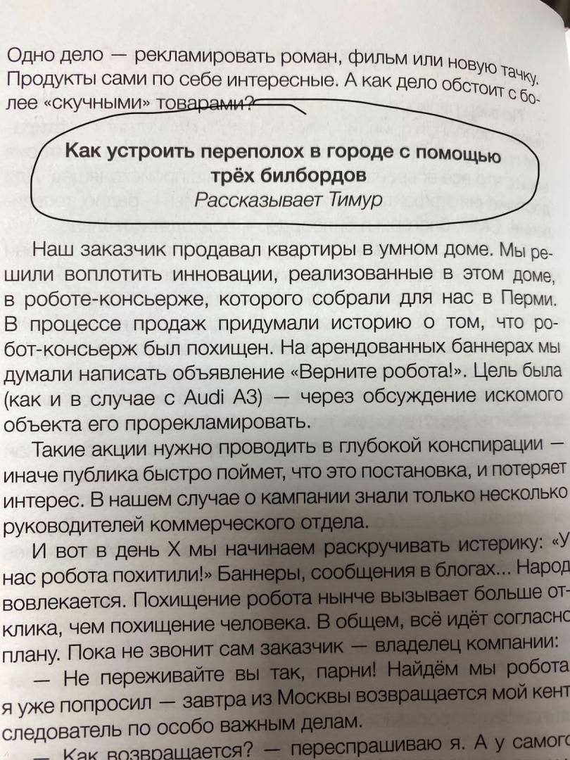 Тимур Захарченко и Вадим Шевченко убеждены: более чем реально. Для этого они придумали иммерсивный маркетинг. Его суть — смешение реальности и вымысла. Как в театре. Никаких рекламных роликов и баннеров — вместо этого ставится «спектакль», цель которого в том, чтобы «зритель» забылся и поверил в происходящее. Это метод для практиков и результатчиков. Для тех, кто хочет потратить деньги на рекламу, чтобы получить от неё отдачу. В книге авторы собрали самые успешные кейсы за свой более чем десятилетний опыт работы, описав их подробно, ёмко и с юмором.Насколько реально…