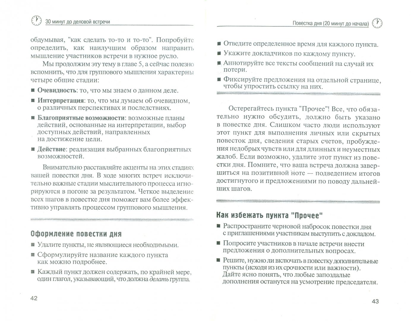 ОписаниеПроведение деловой встречи - непростая задача. Что включить в повестку дня? Насколько формальной или неформальной она должна быть? Нужно ли соблюдать ее с точностью до минут? Всего за 30 минут, необходимые для прочтения этой книги, вы получите ответы на многие вопросы. Вы приобретете уверенность в успехе деловой встречи и сможете выполнить все важные предварительные шаги: подготовить повестку дня; выбрать время и место встречи; согласовать действия участников; придерживаться принятых решений. В книге описаны необходимые действия, позволяющие ничего не упустить из виду и обеспечивающие успех любой деловой встречи. Алан Баркер - консультант по вопросам общения и творчества. Автор книг "Как развить навыки принятия решений" и "Как лучше проводить собрания".Проведение деловой встречи - непростая задача. Что включить в повестку дня? Насколько формальной или неформальной она должна быть? Нужно ли соблюдать ее с точностью до минут? Всего за 30 минут, необходимые для прочтения этой книги, вы получите ответы на многие вопросы. Вы приобретете уверенность в успехе деловой встречи и сможете выполнить все важные предварительные шаги: подготовить повестку дня; выбрать время и место встречи; согласовать действия участников; придерживаться принятых решений. В книге описаны необходимые действия, позволяющие ничего не упустить из виду и обеспечивающие успех любой деловой встречи. Алан Баркер - консультант по вопросам общения и творчества. Автор книг "Как развить навыки принятия решений" и "Как лучше проводить собрания".