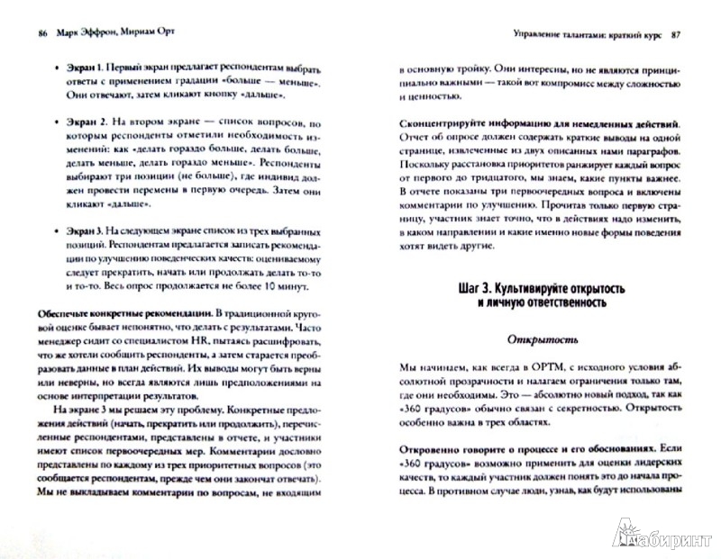 ОписаниеВ этой книге Марк Эфрон и Мириам Орт понятным непрофессионалу языком рассказывают о новой концепции управления талантами. Большая практика авторов по работе с кадрами в ряде крупных компаний наглядно проиллюстрирована яркими примерами, которые дают возможность новичкам без больших затруднений разобраться в сути предлагаемого метода. Данная разработка по управлению трудовыми ресурсами и талантами отличается от традиционных методов простотой и эффективностью применения. Цель краткого курса управления талантами - увеличить потенциал и качество персонала самым простым и легким способом. Книга предназначена для широкого круга читателей, интересующихся вопросами управления и кадровыми ресурсами.В этой книге Марк Эфрон и Мириам Орт понятным непрофессионалу языком рассказывают о новой концепции управления талантами. Большая практика авторов по работе с кадрами в ряде крупных компаний наглядно проиллюстрирована яркими примерами, которые дают возможность новичкам без больших затруднений разобраться в сути предлагаемого метода. Данная разработка по управлению трудовыми ресурсами и талантами отличается от традиционных методов простотой и эффективностью применения. Цель краткого курса управления талантами - увеличить потенциал и качество персонала самым простым и легким способом. Книга предназначена для широкого круга читателей, интересующихся вопросами управления и кадровыми ресурсами.
