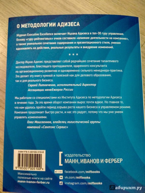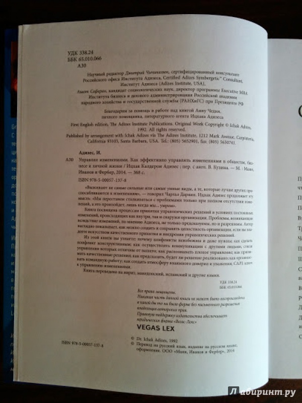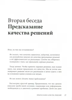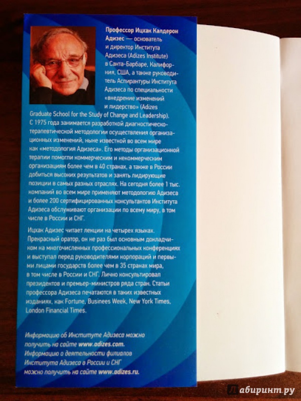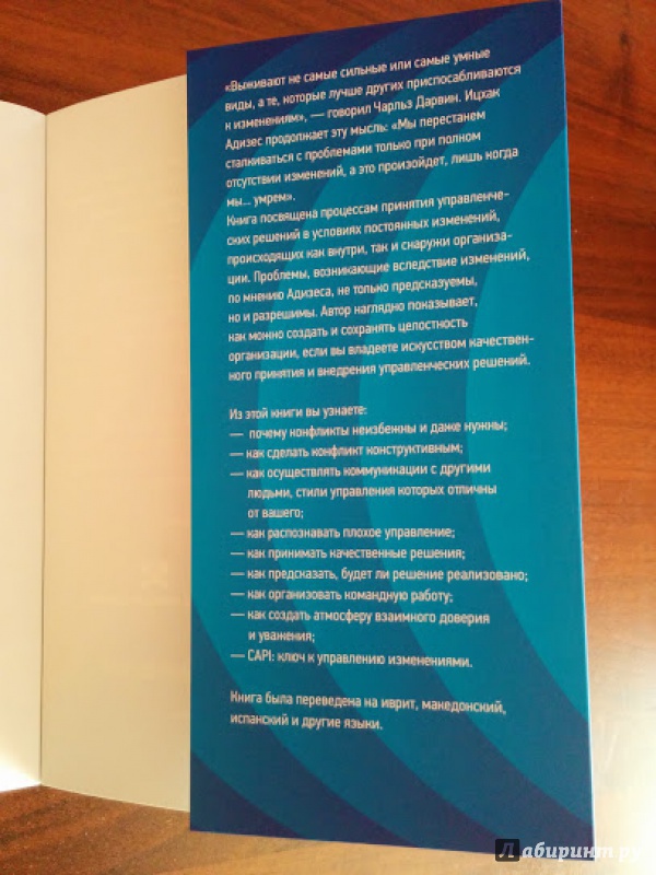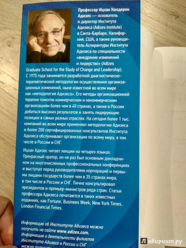 Описание"Выживают не самые сильные или самые умные виды, а те, которые лучше других приспосабливаются к изменениям", - говорил Чарльз Дарвин. Ицхак Адизес продолжает эту мысль: "Мы перестанем сталкиваться с проблемами только при полном отсутствии изменений, а это произойдет, лишь когда мы... умрем".Книга посвящена процессам принятия управленческих решений в условиях постоянных изменений, происходящих как внутри, так и снаружи организации. Проблемы, возникающие вследствие изменений, по мнению Адизеса, не только предсказуемы, но и разрешимы. Автор наглядно показывает, как можно создать и сохранять целостность организации, если вы владеете искусством качественного принятия и внедрения управленческих решений.Из этой книги вы узнаете: почему конфликты неизбежны и даже нужны; как сделать конфликт конструктивным; как осуществлять коммуникации с другими людьми, стили управления которых отличны от вашего; как распознавать плохое управление; как принимать качественные решения; как предсказать, будет ли решение реализовано; как организовать командную работу; как создать атмосферу взаимного доверия и уважения; CAPI: ключ к управлению изменениями.Книга переведена на иврит, македонский, испанский и другие языки.5-е издание.Свернуть"Выживают не самые сильные или самые умные виды, а те, которые лучше других приспосабливаются к изменениям", - говорил Чарльз Дарвин. Ицхак Адизес продолжает эту мысль: "Мы перестанем сталкиваться с проблемами только при полном отсутствии изменений, а это произойдет, лишь когда мы... умрем".Книга посвящена процессам принятия управленческих решений в условиях постоянных изменений, происходящих как внутри, так и снаружи организации. Проблемы, возникающие вследствие изменений, по мнению Адизеса, не только предсказуемы, но и разрешимы. Автор наглядно показывает, как можно создать и сохранять целостность организации, если вы владеете искусством качественного принятия и внедрения управленческих решений.Из этой книги вы узнаете: почему конфликты неизбежны и даже нужны; как сделать конфликт конструктивным; как осуществлять коммуникации с другими людьми, стили управления которых отличны от вашего; как распознавать плохое управление; как принимать качественные решения; как предсказать, будет ли решение реализовано; как организовать командную работу; как создать атмосферу взаимного доверия и уважения; CAPI: ключ к управлению изменениями.Книга переведена на иврит, македонский, испанский и другие языки.5-е издание.СвернутьСвернуть
