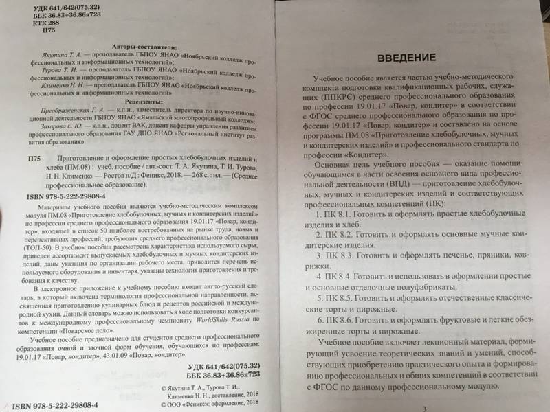 ОписаниеМатериалы учебного пособия являются учебно-методическим комплексом модуля ПМ.08 "Приготовление хлебобулочных, мучных и кондитерских изделий" по профессии среднего профессионального образования 19.01.17 "Повар, кондитер", входящей в список 50 наиболее востребованных на рынке труда, новых и перспективных профессий, требующих среднего профессионального образования (ТОП-50). В учебном пособии рассмотрена характеристика используемого сырья, приведен ассортимент выпускаемых хлебобулочных и мучных кондитерских изделий, даны указания по организации рабочего места, приводится перечень используемого оборудования и инвентаря, указаны технология приготовления и требования к качеству.В электронное приложение к учебному пособию входит англо-русский словарь, в который включена терминология профессиональной направленности, посвященная приготовлению кулинарных блюд и рецептов российской и международной кухни. Данный словарь можно использовать в ходе подготовки конкурсантов к международному профессиональному чемпионату WorldSkills Russia no компетенции "Поварское дело".Учебное пособие предназначено для студентов среднего профессионального образования очной и заочной форм обучения, обучающихся по профессиям: 19.01.17 "Повар, кондитер". 43.01.09 "Повар, кондитер".СвернутьМатериалы учебного пособия являются учебно-методическим комплексом модуля ПМ.08 "Приготовление хлебобулочных, мучных и кондитерских изделий" по профессии среднего профессионального образования 19.01.17 "Повар, кондитер", входящей в список 50 наиболее востребованных на рынке труда, новых и перспективных профессий, требующих среднего профессионального образования (ТОП-50). В учебном пособии рассмотрена характеристика используемого сырья, приведен ассортимент выпускаемых хлебобулочных и мучных кондитерских изделий, даны указания по организации рабочего места, приводится перечень используемого оборудования и инвентаря, указаны технология приготовления и требования к качеству.В электронное приложение к учебному пособию входит англо-русский словарь, в который включена терминология профессиональной направленности, посвященная приготовлению кулинарных блюд и рецептов российской и международной кухни. Данный словарь можно использовать в ходе подготовки конкурсантов к международному профессиональному чемпионату WorldSkills Russia no компетенции "Поварское дело".Учебное пособие предназначено для студентов среднего профессионального образования очной и заочной форм обучения, обучающихся по профессиям: 19.01.17 "Повар, кондитер". 43.01.09 "Повар, кондитер".СвернутьСвернуть