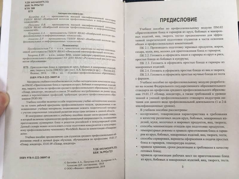 ОписаниеМатериалы учебного пособия являются учебно-методическим комплексом модуля ПМ.02 "Приготовление блюд и гарниров из круп, бобовых и макаронных изделий, яиц, творога, теста" по профессии среднего профессионального образования 19.01.17 "Повар, кондитер", входящей в список 50 наиболее востребованных на рынке труда, новых и перспективных профессий, требующих среднего профессионального образования (ТОП-50).Учебное пособие включает в себя теоретические учебно-методические комплекты по темам рабочей программы профессионального модуля, традиционные и инновационные учебные материалы, позволяющие освоить теоретический материал с учетом современных тенденций развития индустрии питания в данной области.В электронное приложение к учебному пособию входит англо-русский словарь, в который включена терминология профессиональной направленности, посвященная приготовлению кулинарных блюд и рецептов российской и международной кухни. Данный словарь можно использовать в ходе подготовки конкурсанта к международному профессиональному чемпионату WorlJSkills Russia по компетенции "Поварское дело".Учебное пособие предназначено для студентов среднего профессионального образования очной и заочной форм обучения, обучающихся по профессиям: 19.01.17 "Повар, кондитер". 43.01.09 "Повар, кондитер".СвернутьМатериалы учебного пособия являются учебно-методическим комплексом модуля ПМ.02 "Приготовление блюд и гарниров из круп, бобовых и макаронных изделий, яиц, творога, теста" по профессии среднего профессионального образования 19.01.17 "Повар, кондитер", входящей в список 50 наиболее востребованных на рынке труда, новых и перспективных профессий, требующих среднего профессионального образования (ТОП-50).Учебное пособие включает в себя теоретические учебно-методические комплекты по темам рабочей программы профессионального модуля, традиционные и инновационные учебные материалы, позволяющие освоить теоретический материал с учетом современных тенденций развития индустрии питания в данной области.В электронное приложение к учебному пособию входит англо-русский словарь, в который включена терминология профессиональной направленности, посвященная приготовлению кулинарных блюд и рецептов российской и международной кухни. Данный словарь можно использовать в ходе подготовки конкурсанта к международному профессиональному чемпионату WorlJSkills Russia по компетенции "Поварское дело".Учебное пособие предназначено для студентов среднего профессионального образования очной и заочной форм обучения, обучающихся по профессиям: 19.01.17 "Повар, кондитер". 43.01.09 "Повар, кондитер".СвернутьСвернуть