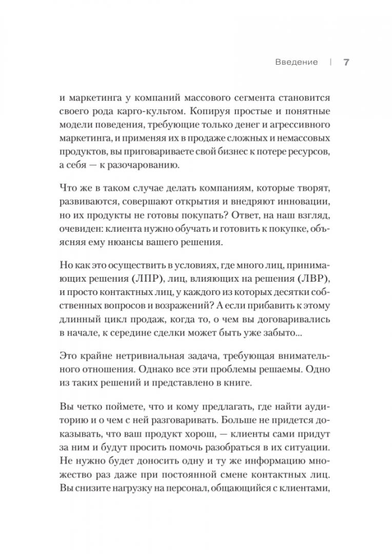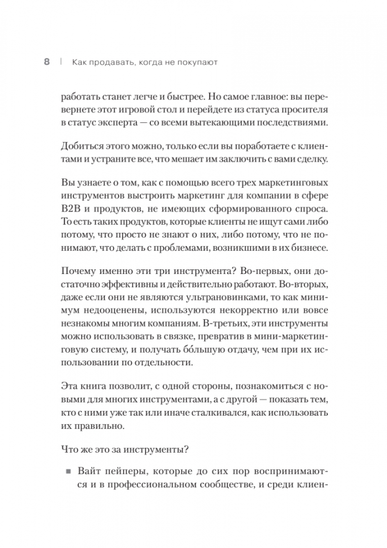 ОписаниеЭта книга о том, как с помощью всего трех маркетинговых инструментов - вайт пейпер (white paper), авторассылки и кейсов - можно построить маркетинг для своей компании в сфере B2B и для продуктов, которые не имеют сформированного спроса.Предложенные инструменты проверены и эффективны. Они также могут быть использованы в связке как мини-маркетинговая система и принесут гораздо большую отдачу, чем по отдельности. Вы узнаете, как привести клиента в вашу компанию, не бегая за ним, и как привлечь внимание к своему бизнесу без ценового и рекламного давления. Вы получите четкое понимание механизмов и принципов работы маркетинговых инструментов, их интеграции в ваш бизнес, возможностей, которые они представляют для роста вашей компании и ее прибыли.В книге вы найдете тот маркетинговый минимум, на основе которого научитесь регулярно приводить новых клиентов, получите максимум отдачи от поступающих заявок, увеличите количество повторных сделок, поднимите продажи вашей компании, выстроите маркетинг и избавитесь от ненужных трат. Всего три инструмента которые изменят не только ваш маркетинг, но и ваш бизнес.Издание адресовано собственникам, директорам по маркетингу, коммерческим директорам и маркетологам компаний, продающих новые, инновационные, интеллектуальные товары или услуги, а также продукты, требующие развитой экспертизы или навыков.СвернутьЭта книга о том, как с помощью всего трех маркетинговых инструментов - вайт пейпер (white paper), авторассылки и кейсов - можно построить маркетинг для своей компании в сфере B2B и для продуктов, которые не имеют сформированного спроса.Предложенные инструменты проверены и эффективны. Они также могут быть использованы в связке как мини-маркетинговая система и принесут гораздо большую отдачу, чем по отдельности. Вы узнаете, как привести клиента в вашу компанию, не бегая за ним, и как привлечь внимание к своему бизнесу без ценового и рекламного давления. Вы получите четкое понимание механизмов и принципов работы маркетинговых инструментов, их интеграции в ваш бизнес, возможностей, которые они представляют для роста вашей компании и ее прибыли.В книге вы найдете тот маркетинговый минимум, на основе которого научитесь регулярно приводить новых клиентов, получите максимум отдачи от поступающих заявок, увеличите количество повторных сделок, поднимите продажи вашей компании, выстроите маркетинг и избавитесь от ненужных трат. Всего три инструмента которые изменят не только ваш маркетинг, но и ваш бизнес.Издание адресовано собственникам, директорам по маркетингу, коммерческим директорам и маркетологам компаний, продающих новые, инновационные, интеллектуальные товары или услуги, а также продукты, требующие развитой экспертизы или навыков.СвернутьСвернуть