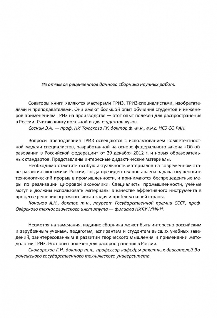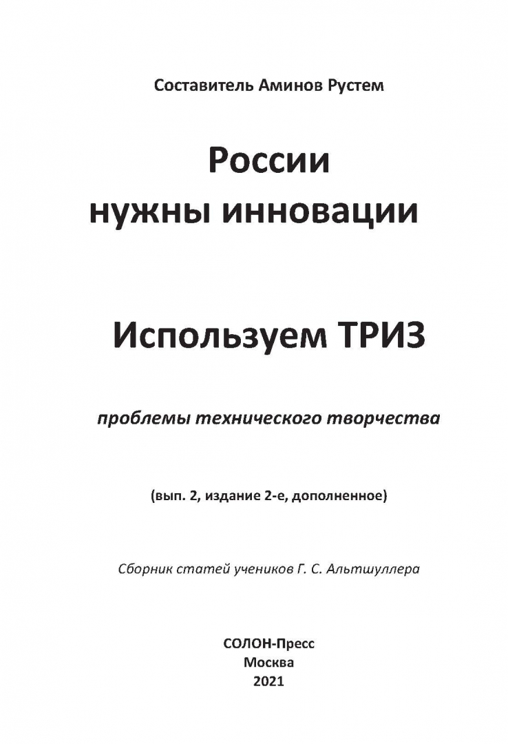 ОписаниеВ сборник включены работы учеников Г.С. Альтшуллера (15.10.1926-24.09.1998), автора теории решения изобретательских задач (ТРИЗ). Работы выполнены в 2015-2019 гг. Авторы работ раскрывают вопросы теории и практики ТРИЗ в решениях нестандартных проблем. Содержание может быть полезно особенно в условиях кризиса ХХI века для практического обучения инженеров, студентов и учащихся школ. Отдельные статьи можно использовать для развития компетенций специалистов в соответствии с федеральным законом "Об образовании в Российской Федерации" от 29 декабря 2012 г. №274-ФЗ и образовательных стандартов.Статьи опубликованы в авторской редакции.2-е издание, дополненное.В сборник включены работы учеников Г.С. Альтшуллера (15.10.1926-24.09.1998), автора теории решения изобретательских задач (ТРИЗ). Работы выполнены в 2015-2019 гг. Авторы работ раскрывают вопросы теории и практики ТРИЗ в решениях нестандартных проблем. Содержание может быть полезно особенно в условиях кризиса ХХI века для практического обучения инженеров, студентов и учащихся школ. Отдельные статьи можно использовать для развития компетенций специалистов в соответствии с федеральным законом "Об образовании в Российской Федерации" от 29 декабря 2012 г. №274-ФЗ и образовательных стандартов.Статьи опубликованы в авторской редакции.2-е издание, дополненное.