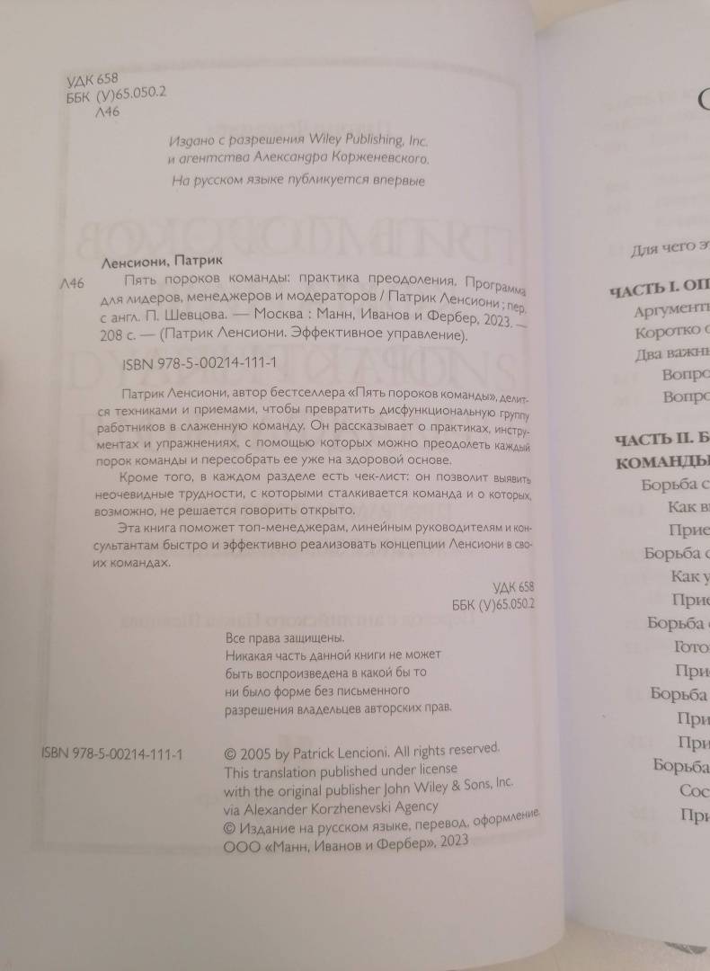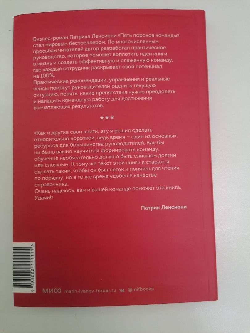 ОписаниеПатрик Ленсиони, автор бестселлера "Пять пороков команды", делится техниками и приемами, чтобы превратить дисфункциональную группу работников в слаженную команду.Ленсиони рассказывает о практиках, инструментах и упражнениях, с помощью которых можно преодолеть каждый порок команды и пересобрать ее уже на здоровой основе.Кроме того, в каждом разделе есть чек-лист, который поможет выявить неочевидные трудности, с которыми сталкивается команда и о которых, возможно, не решается говорить открыто.Эта книга поможет топ-менеджерам, линейным руководителям и консультантам быстро и эффективно реализовать концепции Ленсиони в своих командах.Патрик Ленсиони, автор бестселлера "Пять пороков команды", делится техниками и приемами, чтобы превратить дисфункциональную группу работников в слаженную команду.Ленсиони рассказывает о практиках, инструментах и упражнениях, с помощью которых можно преодолеть каждый порок команды и пересобрать ее уже на здоровой основе.Кроме того, в каждом разделе есть чек-лист, который поможет выявить неочевидные трудности, с которыми сталкивается команда и о которых, возможно, не решается говорить открыто.Эта книга поможет топ-менеджерам, линейным руководителям и консультантам быстро и эффективно реализовать концепции Ленсиони в своих командах.
