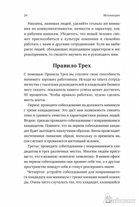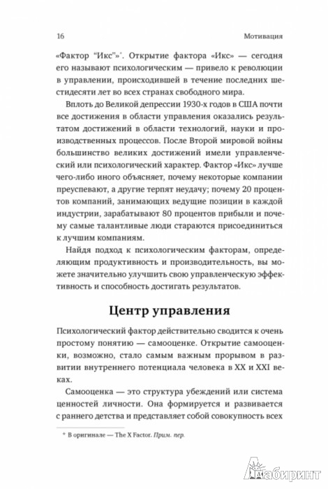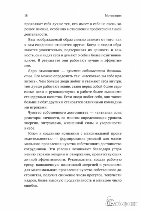 ОписаниеО книгеСогласно Брайану Трейси, смысл эффективной мотивации в том, чтобы создать среду, в которой каждый человек захочет и сможет работать на 100%.Справиться с непростой задачей помогут четкие принципы и понятные примеры, изложенные в этой книге.Книга рассказывает, от чего зависит производительность персонала, как нанимать правильных сотрудников и стоит ли сразу же нагружать новичков работой, как ставить задачи и контролировать их выполнение.Брайан Трейси - мировой эксперт в вопросах эффективности и мотивации. Среди клиентов Трейси Johnson & Johnson, IBM, Motorola; а за карьеру лектора он провел несколько тысяч семинаров по всему миру, в том числе и в России.Кроме того, Брайан Трейси написал несколько книг, переведенных на 40 языков, включая бестселлер "Выйди из зоны комфорта. Измени свою жизнь". В мире куплено больше миллиона его экземпляров.Более 500 000 человек подписаны на страницу Трейси в FacebookДля кого эта книгаДля тех, кто заинтересован в том, чтобы его сотрудники работали с полной отдачей.Для тех, кто прочитал бестселлер Брайана Трейси "Выйди из зоны комфорта. Измени свою жизнь".Фишки книги21 работающий метод повышения мотивации.От автораПо данным Robert Half and Associates, среднестатистический человек работает только на 50 процентов своих возможностей. Ваша задача - найти доступ к неиспользованным 50 процентам, за которые платит компания, и направить это время и энергию на более эффективную и качественную работу.Об автореБрайан Трейси считается одним из крупнейших мировых авторитетов в психологии успеха и достижений. Написал более сорока книг, включая ряд бестселлеров, записал три с лишним сотни учебных аудио- и видеопрограмм на разных языках.СвернутьО книгеСогласно Брайану Трейси, смысл эффективной мотивации в том, чтобы создать среду, в которой каждый человек захочет и сможет работать на 100%.Справиться с непростой задачей помогут четкие принципы и понятные примеры, изложенные в этой книге.Книга рассказывает, от чего зависит производительность персонала, как нанимать правильных сотрудников и стоит ли сразу же нагружать новичков работой, как ставить задачи и контролировать их выполнение.Брайан Трейси - мировой эксперт в вопросах эффективности и мотивации. Среди клиентов Трейси Johnson & Johnson, IBM, Motorola; а за карьеру лектора он провел несколько тысяч семинаров по всему миру, в том числе и в России.Кроме того, Брайан Трейси написал несколько книг, переведенных на 40 языков, включая бестселлер "Выйди из зоны комфорта. Измени свою жизнь". В мире куплено больше миллиона его экземпляров.Более 500 000 человек подписаны на страницу Трейси в FacebookДля кого эта книгаДля тех, кто заинтересован в том, чтобы его сотрудники работали с полной отдачей.Для тех, кто прочитал бестселлер Брайана Трейси "Выйди из зоны комфорта. Измени свою жизнь".Фишки книги21 работающий метод повышения мотивации.От автораПо данным Robert Half and Associates, среднестатистический человек работает только на 50 процентов своих возможностей. Ваша задача - найти доступ к неиспользованным 50 процентам, за которые платит компания, и направить это время и энергию на более эффективную и качественную работу.Об автореБрайан Трейси считается одним из крупнейших мировых авторитетов в психологии успеха и достижений. Написал более сорока книг, включая ряд бестселлеров, записал три с лишним сотни учебных аудио- 