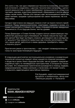 ОписаниеПрогноз развития современных технологий и их конвергенции в ближайшие десятилетия от авторов бестселлера «Изобилие» Питера Диамандиса и научного журналиста Стивена Котлера.Это книга о том, как одни современные технологии (например, искусственный интеллект), соединяясь с другими (например, с дополненной реальностью), в корне преображают и переписывают по новым правилам работу промышленности, розничную торговлю, рекламу, индустрию развлечений, образование и многие другие сферы нашей жизни. Причем этот процесс идет экспоненциально нарастающими темпами, придавая турбоускорение как темпам перемен в мире, так и их масштабам.Сегодня практически все ведущие отрасли стоят на пороге полного преображения. Перед предпринимателями, новаторами, лидерами и всеми, кто сумеет рассмотреть и поймать этот тренд, открываются ранее невиданные возможности. И это будущее ближе, чем мы думаем. Авторы разбирают наиболее общие тренды и их преобразующее воздействие на бизнес, промышленность и нашу жизнь. Так что пристегните ремни и приготовьтесь, вас ожидает головокружительная гонка.Для кого книгаДля руководителей и предпринимателей, которые смотрят в будущее и находят в нем возможности для развития.Для тех, кто интересуется развитием технологий и бизнес-процессов.Для всех, кто интересуется будущим человечества.От авторовВ наших предыдущих книгах «Изобилие» и «Без тормозов» мы ввели понятие экспоненциально ускоряющейся технологии, понимая под ней всякую технологию, которая через регулярные промежутки времени удваивает свои возможности и при этом теряет в цене. Классический пример — Закон Мура. В 1965 г. основатель Intel Гордон Мур обратил внимание, что число помещающихся на интегральной схеме транзисторов каждые 18 месяцев удваивается. А это означало, что каждые полтора года компьютеры удваивают свою мощность, не прибавляя при этом в цене.Мур счел, что это изумительно. Он спрогнозировал, что такая тенденция продержится еще несколько лет, может, пять, а то и все десять. А продержалась она и 20 лет, и 40, а собирается и все 60. Именно Закон Мура объясняет, почему смартфон в вашем кармане в тысячу раз меньше, в тысячу раз дешевле и в тысячу раз мощнее суперкомпьютера родом из 1970-х.Причем тренд не замедляется.Несмотря на все сообщения о близкой «тепловой смерти» Закона Мура в 2023 г. средненький тысячедолларовый ноутбук приобретет такую же вычислительную мощность, как у человеческого мозга (около 1016 операций в секунду). А еще через 25 лет тот же средней руки аппарат сравняется по вычислительной мощности с совокупной мыслительной мощью мозгов всего живущего человечества.Но что еще важнее, не одни только интегральные схемы прогрессируют такими темпами. В 1990-х технический директор Google и партнер Питера, сооснователь Университета сингулярности Рэй Курцвейл заметил, что стоит технологии стать цифровой — в смысле возможности программировать ее при помощи единиц и нулей компьютерного кода, — как она вспрыгивает на закон Мура и начинает экспоненциально ускоряться.Проще говоря, мы используем наши новые компьютеры, чтобы проектировать новые еще более быстродействующие компьютеры, и это создает петлю положительной обратной связи, которая еще больше ускоряет наше ускорение. Курцвейл называет это «Законом ускоряющейся отдачи» . К технологиям, которы