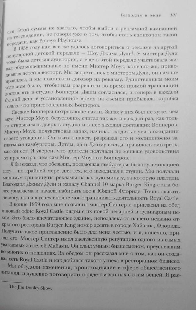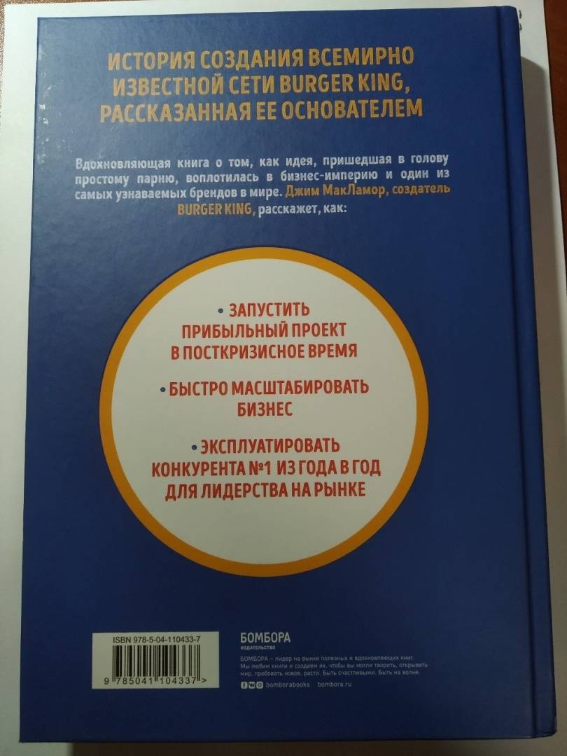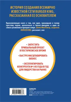 ОписаниеВдохновляющая история создания всемирно известной сети Burger King из первых уст от одного из величайших новаторов Америки. Джим МакЛамор, основатель Burger King, расскажет, как пройти путь от идеи до бизнес-империи, выделиться среди конкурентов и создать любимый миллионами бренд.Вдохновляющая история создания всемирно известной сети Burger King из первых уст от одного из величайших новаторов Америки. Джим МакЛамор, основатель Burger King, расскажет, как пройти путь от идеи до бизнес-империи, выделиться среди конкурентов и создать любимый миллионами бренд.