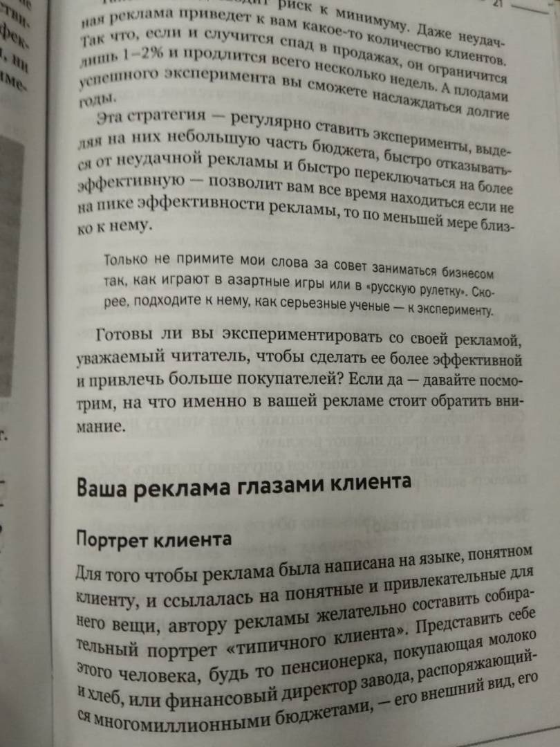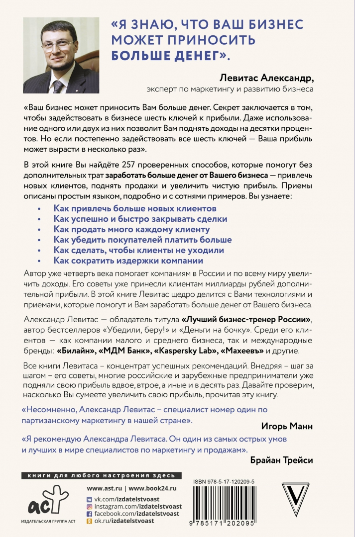 Описание«Я знаю, что Ваш бизнес может приносить больше денег».Левитас Александр, эксперт по маркетингу и развитию бизнеса«Ваш бизнес может приносить Вам больше денег. Секрет заключается в том, чтобы задействовать в бизнесе шесть ключей к прибыли. Даже использование одного или двух из них позволит Вам поднять доходы на десятки процентов. Но если постепенно задействовать все шесть ключей – Ваша прибыли может вырасти в несколько раз».В этой книге Вы найдете 257 проверенных способов, которые помогут без дополнительных трат заработать больше денег от Вашего бизнеса – привлечь новых клиентов, поднять продажи и увеличить чистую прибыль. Приемы описаны простым языком, подробно и с сотнями примеров. Вы узнаете:• Как привлечь больше новых клиентов• Как успешно и быстро закрывать сделки• Как продать много каждому клиенту• Как убедить покупателей платить больше• Как сделать, чтобы клиенты не уходили• Как сократить издержки компанииАвтор уже четверть века помогает компаниям в России и по всему миру увеличить доходы. Его советы уже принесли клиентам миллиарды рублей дополнительной прибыли. В этой книге Левитас щедро делится с Вами технологиями и приемами, которые помогут и Вам заработать больше денег от Вашего бизнеса.Александр Левитас – обладатель титула «Лучший бизнес-тренер России», автор бестселлеров «Убедили, беру!» и «Деньги на бочку». Среди его клиентов – как компании малого и среднего бизнеса, так и международные бренды: «Билайн», «МДК Банк», «Kaspersky Lab», «Махеевъ» и другие.Все книги Левитаса – концентрат успешных рекомендаций. Внедряя – шаг за шагом – его советы, многие российские и зарубежные предприниматели уже подняли свою прибыль вдвое, втрое, а иные и в десять раз. Давайте проверим, насколько Вы сумеете увеличить свою прибыль, прочитав эту книгу.Свернуть«Я знаю, что Ваш бизнес может приносить больше денег».Левитас Александр, эксперт по маркетингу и развитию бизнеса«Ваш бизнес может приносить Вам больше денег. Секрет заключается в том, чтобы задействовать в бизнесе шесть ключей к прибыли. Даже использование одного или двух из них позволит Вам поднять доходы на десятки процентов. Но если постепенно задействовать все шесть ключей – Ваша прибыли может вырасти в несколько раз».В этой книге Вы найдете 257 проверенных способов, которые помогут без дополнительных трат заработать больше денег от Вашего бизнеса – привлечь новых клиентов, поднять продажи и увеличить чистую прибыль. Приемы описаны простым языком, подробно и с сотнями примеров. Вы узнаете:• Как привлечь больше новых клиентов• Как успешно и быстро закрывать сделки• Как продать много каждому клиенту• Как убедить покупателей платить больше• Как сделать, чтобы клиенты не уходили• Как сократить издержки компанииАвтор уже четверть века помогает компаниям в России и по всему миру увеличить доходы. Его советы уже принесли клиентам миллиарды рублей дополнительной прибыли. В этой книге Левитас щедро делится с Вами технологиями и приемами, которые помогут и Вам заработать больше денег от Вашего бизнеса.Александр Левитас – обладатель титула «Лучший бизнес-тренер России», автор бестселлеров «Убедили, беру!» и «Деньги на бочку». Среди его клиентов – как компании малого и среднего бизнеса, так и международные бренды: «Билайн», «МДК Банк», «Kaspersky Lab», «Махеевъ» и 