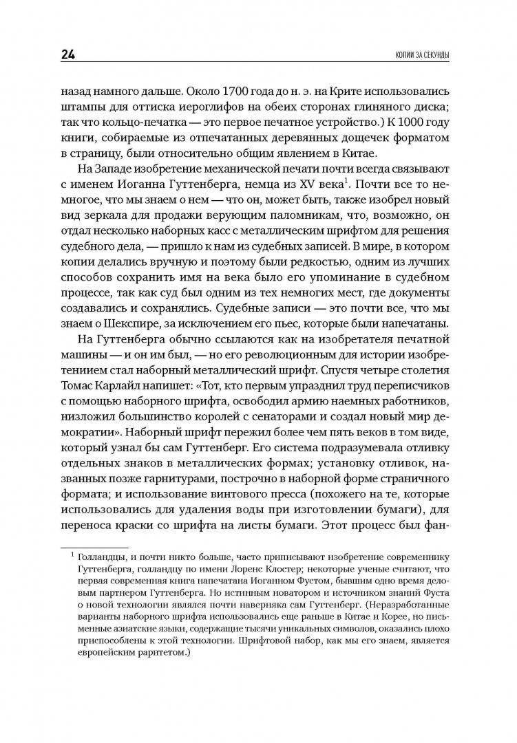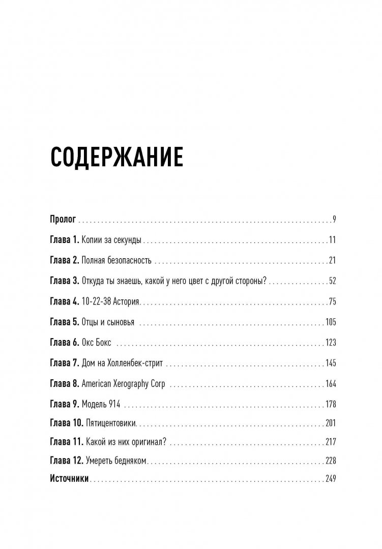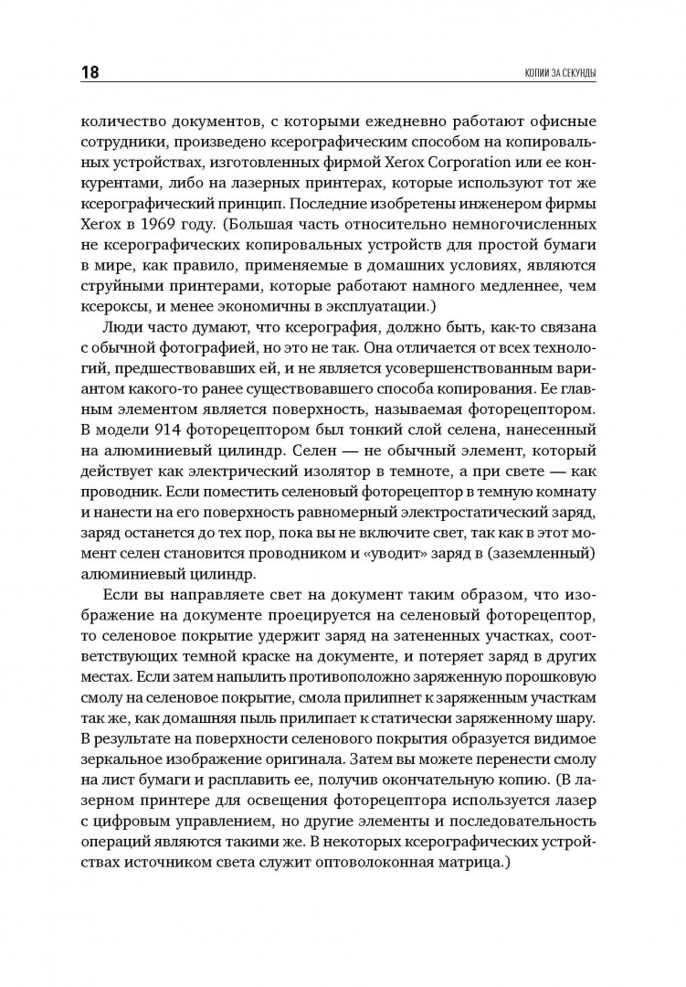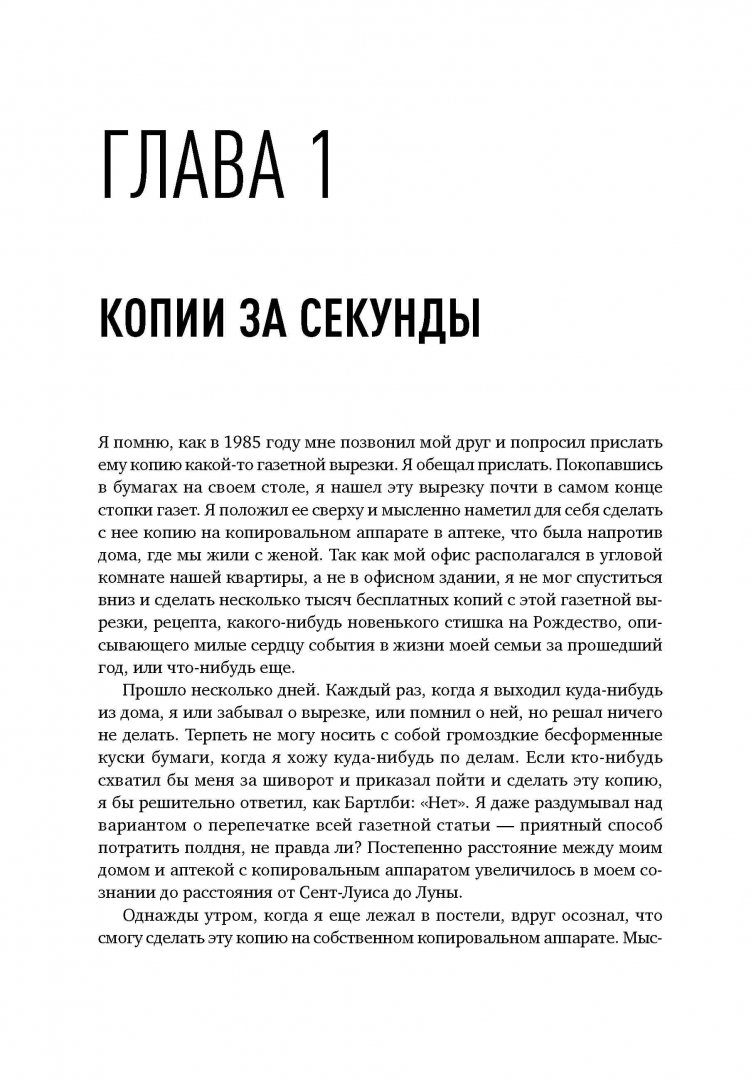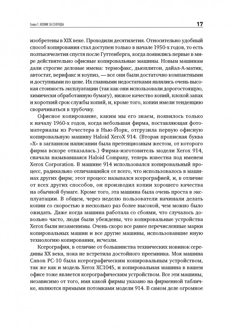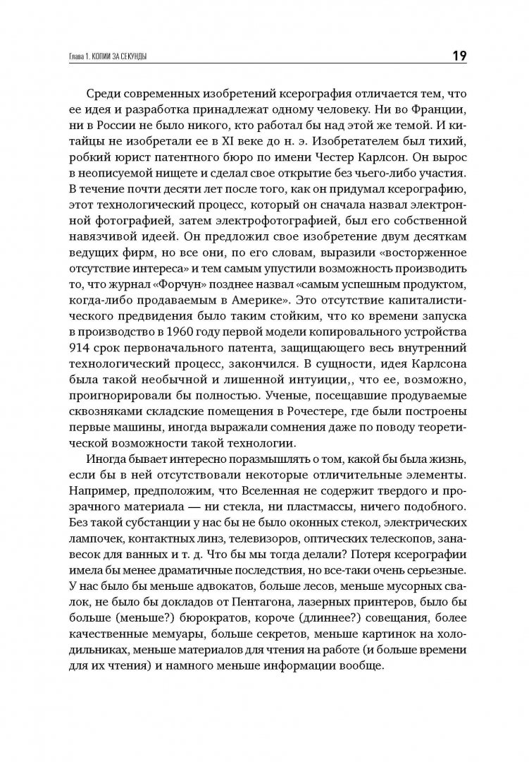 ОписаниеЖурналист Дэвид Оуэн рассказывает историю изобретения, без которого немыслима жизнь современного офиса - копировального аппарата. Уникальный случай: он был создан усилиями практически одного человека. Поразительное упорство изобретателя Честера Карлсона принесло ему славу второго Гутенберга и избавило тысячи людей на планете от изнурительного переписывания документов. Автор прослеживает путь Честера от первого ксерографического аппарата, изготовленного в 1938 году, до создания гигантской корпорации Xerox, чье название стало синонимом высочайшего качества и скорости копирования. Это захватывающее повествование о борьбе за реализацию грандиозного открытия, которое журнал Fortune позднее назвал "самым успешным товаром, который когда-либо продавался в Америке".Журналист Дэвид Оуэн рассказывает историю изобретения, без которого немыслима жизнь современного офиса - копировального аппарата. Уникальный случай: он был создан усилиями практически одного человека. Поразительное упорство изобретателя Честера Карлсона принесло ему славу второго Гутенберга и избавило тысячи людей на планете от изнурительного переписывания документов. Автор прослеживает путь Честера от первого ксерографического аппарата, изготовленного в 1938 году, до создания гигантской корпорации Xerox, чье название стало синонимом высочайшего качества и скорости копирования. Это захватывающее повествование о борьбе за реализацию грандиозного открытия, которое журнал Fortune позднее назвал "самым успешным товаром, который когда-либо продавался в Америке".