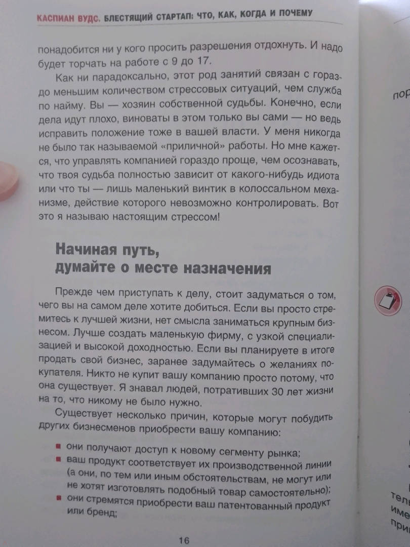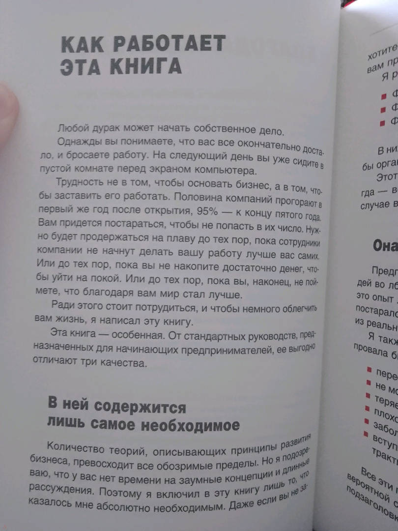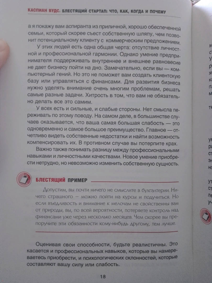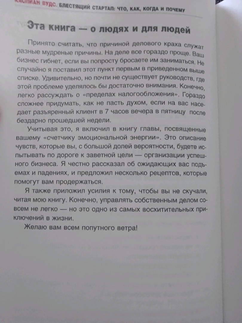 ОписаниеЛюбой дурак может начать собственное дело.Однажды вы понимаете, что вас все окончательно достало, и бросаете работу. На следующий день вы уже сидите в пустой комнате перед экраном компьютера.Трудность не в том, чтобы основать бизнес, а в том, чтобы заставить его работать. Половина компаний прогорают в первый же год после открытия, 95% — к концу пятого года. Вам придется постараться, чтобы не попасть в их число. Нужно будет продержаться на плаву до тех пор, пока сотрудники компании не начнут делать вашу работу лучше вас самих. Или до тех пор, пока вы не накопите достаточно денег, чтобы уйти на покой. Или до тех пор, пока вы, наконец, не поймете, что благодаря вам мир стал лучше.Ради этого стоит потрудиться, и чтобы немного облегчить вам жизнь, я написал эту книгу.Эта книга — особенная. От стандартных руководств, предназначенных для начинающих предпринимателей, ее выгодно отличает проверенная временем практическая методика.Каспиан ВудсО чем книгаПриготовьтесь оказаться на вершине предпринимательского успеха!Автор книги расскажет вам, с чего начинать основание своего бизнеса, и окажет поддержку на каждом его этапе. Читателю предлагается методика «16 шагов», которая легка в освоении и эффективна на практике. Она включает в себя рекомендации по разработке бизнес-идеи, созданию продукта или услуги, а также раскрывает секреты продаж и маркетинговой политики.Кроме того, автор приложил все усилия к тому, чтобы вы не скучали, читая эту книгу: в ней приводится множество примеров из жизни известнейших бизнесменов и истории успеха и краха ведущих мировых компаний.Почему книгу стоит прочитать- вы узнаете, с чего нужно начать основание собственного дела;- вы научитесь важным навыкам начинающего бизнесмена;- вы сможете избегать основных ошибок в ведении бизнеса.Для кого эта книгаКнига рассчитана:- на тех, кто хочет начать свое дело;- на тех, кто желает научиться грамотно управлять своей компанией;- на тех, кто увлекается бизнес-книгами и деловой литературой.Почему решили издатьАвтор опирается на внушительный опыт. Он прошел путь от начинающего бизнесмена до опытного «управленца», с которым сотрудничали сотни успешных предпринимателей.Информация об автореКаспиан Вудс гордится тем, что никогда не нанимался на работу.Будучи студентом, он основал собственное дело, организовав издание первых в Великобритании студенческих ежегодников (печатное издание, аналогичное сегодняшней сети «facebook»). Он управлял компанией, занимавшейся организацией торжественных мероприятий, под названием «Ваши шары — в наших руках». А однажды, чтобы собрать средства на выпуск журнала, посвященного интернет-коммерции, прожил для этого неделю в витрине магазина.Последние 10 лет он и его команда занимаются продвижением компании «Editions», выводя ее на уровень лидирующих британских торгово-финансовых агентств.СвернутьЛюбой дурак может начать собственное дело.Однажды вы понимаете, что вас все окончательно достало, и бросаете работу. На следующий день вы уже сидите в пустой комнате перед экраном компьютера.Трудность не в том, чтобы основать бизнес, а в том, чтобы заставить его работать. Половина компаний прогорают в первый же год после открытия, 95% — к концу пятого года. Вам придется постараться, чтобы не попасть в их число. Нужно будет продержаться на плаву до тех пор