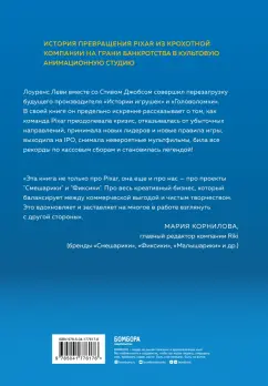 ОписаниеИстория превращения Pixar из крохотной компании на грани банкротства в культовую анимационную студию. Лоуренс Леви вместе со Стивом Джобсом совершил перезагрузку будущего производителя "Истории игрушек" и "Головоломки". В свой книге он предельно искренно рассказывает о том, как команда Pixar преодолевала кризис, отказывалась от убыточных направлений, принимала новых лидеров и новые правила игры, выходила на IPO, снимала невероятные мультфильмы, била все рекорды по кассовым сборам и становилась легендой!История превращения Pixar из крохотной компании на грани банкротства в культовую анимационную студию. Лоуренс Леви вместе со Стивом Джобсом совершил перезагрузку будущего производителя "Истории игрушек" и "Головоломки". В свой книге он предельно искренно рассказывает о том, как команда Pixar преодолевала кризис, отказывалась от убыточных направлений, принимала новых лидеров и новые правила игры, выходила на IPO, снимала невероятные мультфильмы, била все рекорды по кассовым сборам и становилась легендой!
