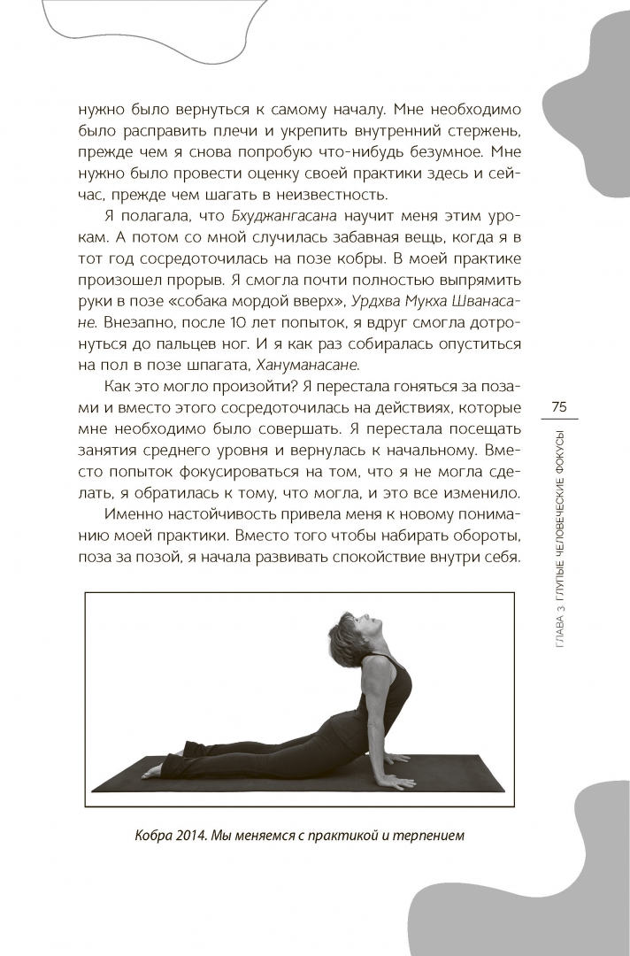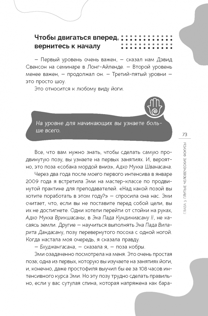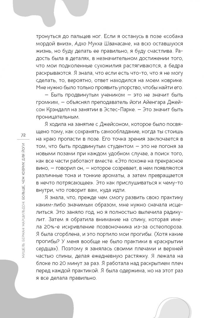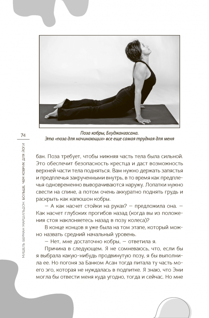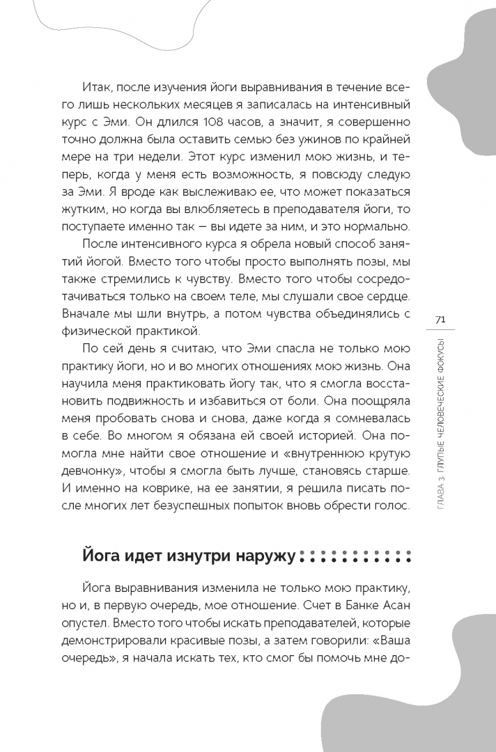 Описание"Больше, чем коврик для йоги" - это глубоко личная история о психологическом взрослении, о преодолении комплексов и ограничивающих убеждений, об осознанном подходе не только к занятиям йогой, но и к жизни в целом.Мы все ищем чего-то большего, даже если не знаем, что именно и где искать. Для автора эта история началась случайно - она просто перепутала классы в спортивном клубе. В итоге практика йоги стала для нее и способом обрести здоровое тело, и кабинетом психотерапии, и возможностью для роста от новичка до тренера и наставника. Благодаря йоге Мишель не только пережила сильнейшие потрясения и победила рак, но и сохранила оптимизм и жизнерадостность.В повествовании тесно переплетаются откровенный рассказ о событиях в жизни автора и полезные напутствия и рекомендации по занятиям йогой, которые помогут вам выстроить свою практику с пользой. Вы научитесь находить ответы на сложные вопросы, которые задаете себе сами. Не воевать с телом или стремиться непременно выполнить самую сложную асану, а наладить контакт с собственной природой. Быть благодарными. Быть "чистым листом" и открываться новому. Это поможет обрести здоровье и душевную гармонию.Увлекательно, трогательно, с огромным чувством юмора и любовью к людям и миру - эта книга будто написана лучшей подругой специально для вас и подарит множество теплых мгновений в приятной компании.Свернуть"Больше, чем коврик для йоги" - это глубоко личная история о психологическом взрослении, о преодолении комплексов и ограничивающих убеждений, об осознанном подходе не только к занятиям йогой, но и к жизни в целом.Мы все ищем чего-то большего, даже если не знаем, что именно и где искать. Для автора эта история началась случайно - она просто перепутала классы в спортивном клубе. В итоге практика йоги стала для нее и способом обрести здоровое тело, и кабинетом психотерапии, и возможностью для роста от новичка до тренера и наставника. Благодаря йоге Мишель не только пережила сильнейшие потрясения и победила рак, но и сохранила оптимизм и жизнерадостность.В повествовании тесно переплетаются откровенный рассказ о событиях в жизни автора и полезные напутствия и рекомендации по занятиям йогой, которые помогут вам выстроить свою практику с пользой. Вы научитесь находить ответы на сложные вопросы, которые задаете себе сами. Не воевать с телом или стремиться непременно выполнить самую сложную асану, а наладить контакт с собственной природой. Быть благодарными. Быть "чистым листом" и открываться новому. Это поможет обрести здоровье и душевную гармонию.Увлекательно, трогательно, с огромным чувством юмора и любовью к людям и миру - эта книга будто написана лучшей подругой специально для вас и подарит множество теплых мгновений в приятной компании.СвернутьСвернуть
