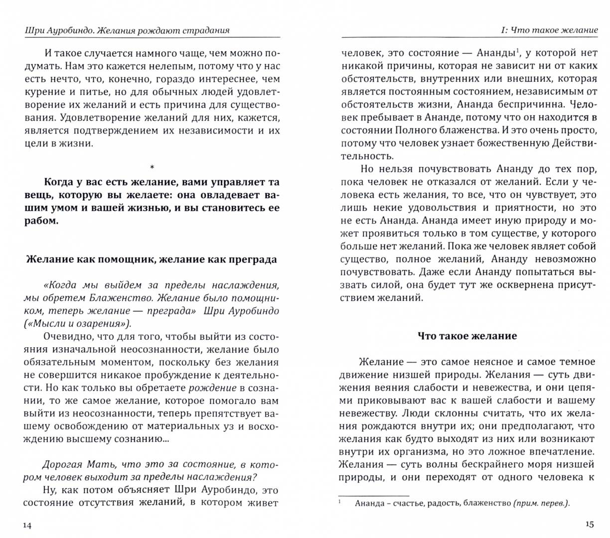 ОписаниеВ данном сборнике представлены произведения выдающихся индийских мыслителей Шри Ауробиндо и Матери (Мирры Альфассы), посвящённые путям избавления от несчастий и страданий. Сборник состоит из трёх книг: 1) "Желания рождают страдания. Беседы с Матерью". 2) "Отказ от желаний. Качество, необходимое на пути йога". 3) "Стремление - божественная сила преображения. Беседы с Шри Ауробиндо и Матерью". Ознакомившись с материалами этого сборника, вы узнаете, что такое желание, какова природа возникновения страданий и что нужно сделать для того, чтобы избежать подчинения и зависимости от материального мира. Данная книга поможет вам устранить из жизни заботы и проблемы, избавиться от депрессии и обрести счастье, мир и радость. Для широкого круга читателей.В данном сборнике представлены произведения выдающихся индийских мыслителей Шри Ауробиндо и Матери (Мирры Альфассы), посвящённые путям избавления от несчастий и страданий. Сборник состоит из трёх книг: 1) "Желания рождают страдания. Беседы с Матерью". 2) "Отказ от желаний. Качество, необходимое на пути йога". 3) "Стремление - божественная сила преображения. Беседы с Шри Ауробиндо и Матерью". Ознакомившись с материалами этого сборника, вы узнаете, что такое желание, какова природа возникновения страданий и что нужно сделать для того, чтобы избежать подчинения и зависимости от материального мира. Данная книга поможет вам устранить из жизни заботы и проблемы, избавиться от депрессии и обрести счастье, мир и радость. Для широкого круга читателей.