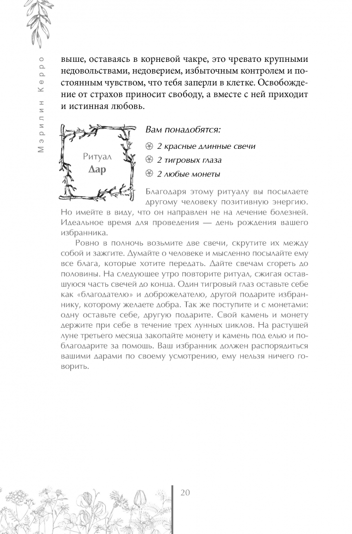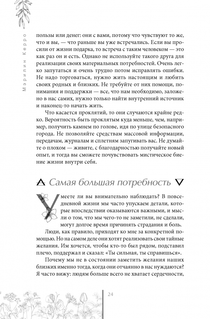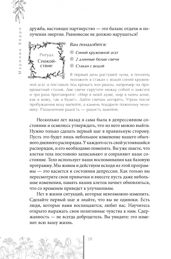 ОписаниеПеред вами долгожданная книга Мэрилин Керро!Вдохновляющая и теплая, она с первых же страниц погружает в волшебный и светлый мир автора. Здесь вы найдете поддержку, утешение и мотивацию для любых задуманных свершений.Мэри отвечает на очень важные вопросы, которые волнуют каждого человека: как быть счастливым и здоровым, как строить гармоничные отношения с друзьями, родственниками и возлюбленными, как жить в достатке и не быть рабом денег.В каждой главе даются простые и мощные ритуалы для обретения душевного спокойствия и избавления от страхов, исполнения желаний, поиска любви, финансового благополучия. Их сила подкреплена многолетним практическим опытом Мэрилин и её искренним желанием помогать людям. Вы также научитесь сами подбирать необходимые цвета и минералы для любого магического воздействия.Эта книга - и советы мудрой наставницы, и задушевный разговор с близкой подругой. Написанная с любовью, она станет мощным подспорьем для вашего духовного возрождения!СвернутьПеред вами долгожданная книга Мэрилин Керро!Вдохновляющая и теплая, она с первых же страниц погружает в волшебный и светлый мир автора. Здесь вы найдете поддержку, утешение и мотивацию для любых задуманных свершений.Мэри отвечает на очень важные вопросы, которые волнуют каждого человека: как быть счастливым и здоровым, как строить гармоничные отношения с друзьями, родственниками и возлюбленными, как жить в достатке и не быть рабом денег.В каждой главе даются простые и мощные ритуалы для обретения душевного спокойствия и избавления от страхов, исполнения желаний, поиска любви, финансового благополучия. Их сила подкреплена многолетним практическим опытом Мэрилин и её искренним желанием помогать людям. Вы также научитесь сами подбирать необходимые цвета и минералы для любого магического воздействия.Эта книга - и советы мудрой наставницы, и задушевный разговор с близкой подругой. Написанная с любовью, она станет мощным подспорьем для вашего духовного возрождения!СвернутьСвернуть