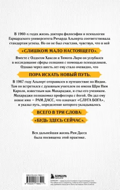 ОписаниеКультовая книга, когда-то открывшая западному миру философию и мировоззрение Востока. В 1960-х годах жизнь доктора философии и психологии Гарвардского университета Ричарда Альперта соответствовала всем стандартам успеха. Но он не был счастлив, чувствуя, что в ней «слишком мало настоящего».В 1967 году Альперт уволился из университета и отправился в путешествие по Индии. Там он встретил духовного учителя по имени Шри Ним Кароли Баба, известного как Махараджи, и стал его учеником, получив имя Рам Дасс, что значит "Слуга Бога".Культовая книга, когда-то открывшая западному миру философию и мировоззрение Востока. В 1960-х годах жизнь доктора философии и психологии Гарвардского университета Ричарда Альперта соответствовала всем стандартам успеха. Но он не был счастлив, чувствуя, что в ней «слишком мало настоящего».В 1967 году Альперт уволился из университета и отправился в путешествие по Индии. Там он встретил духовного учителя по имени Шри Ним Кароли Баба, известного как Махараджи, и стал его учеником, получив имя Рам Дасс, что значит "Слуга Бога".
